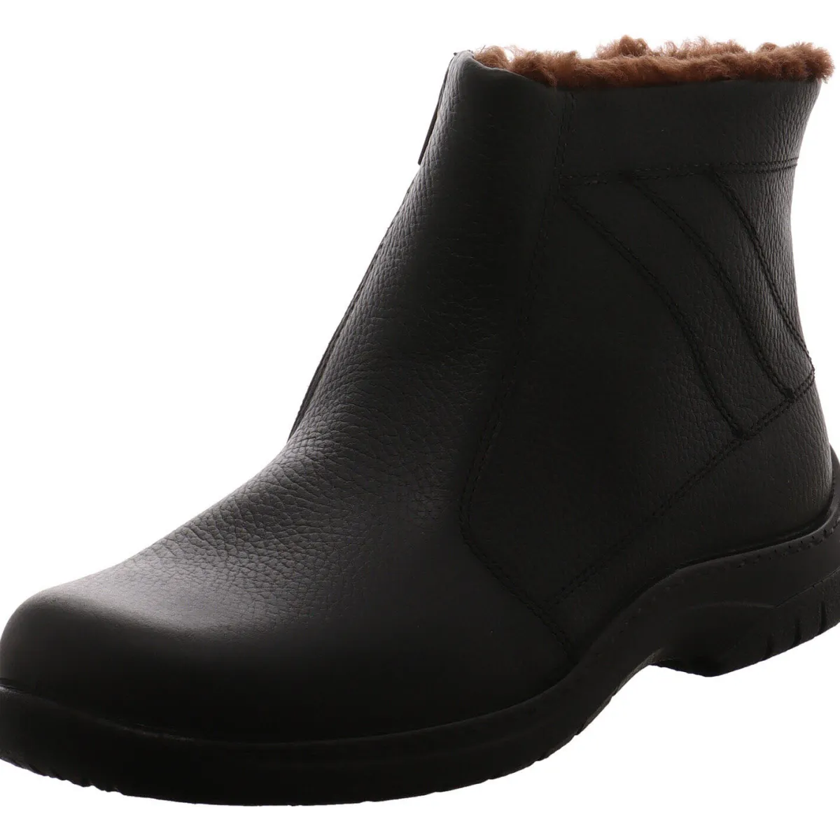 Das Obermaterial aus Echtleder in Schwarz wird durch tonale Ziernähte und die dezente Overlay Optik gekonnt in Szene gesetzt. Das echte Lammfell Innenfutter ist Braun abgesetzt und sorgt dafür, dass Sie auch bei frostigen Temperaturen garantiert keine kalten Füße bekommen.