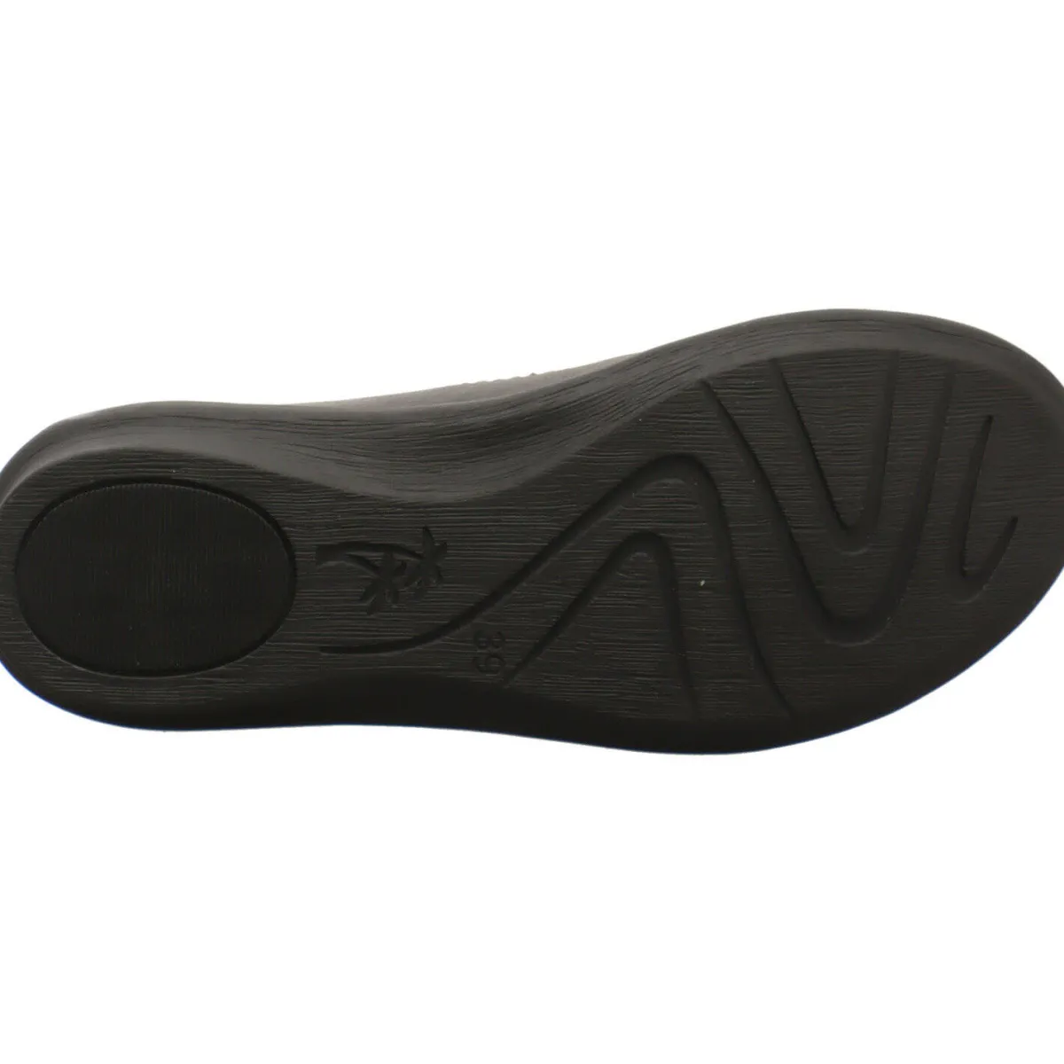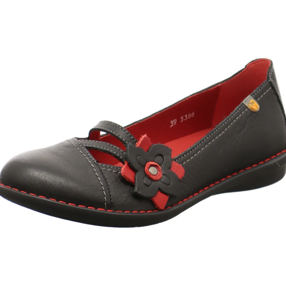 Dieser schöne Damen Ballerina in Schwarz mit Akzenten in Rot beigeistert durch sein ungewöhnliches Design und ist ein Schuh zum wohlfühlen. Die Blume auf dem Blatt ist ein besonders schönes Detail.