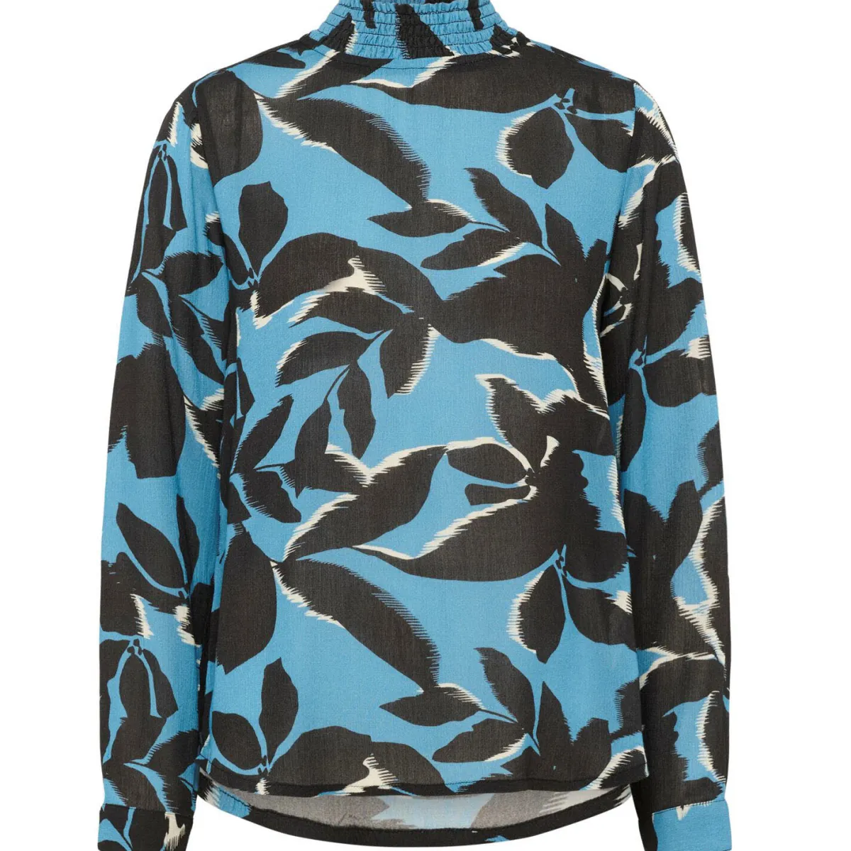 Der leichte, fließende Viskose Stoff in Blau ist mit einem Print in Schwarz, mit Blättern verziert und verleiht ihr einen verspielten Look.