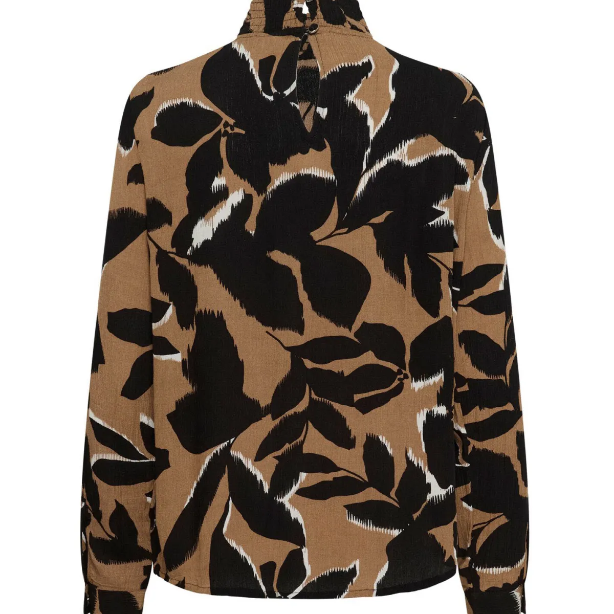 Der leichte, fließende Viskose Stoff in Braun ist mit einem Print in Schwarz, mit Blättern verziert und verleiht ihr einen verspielten Look.