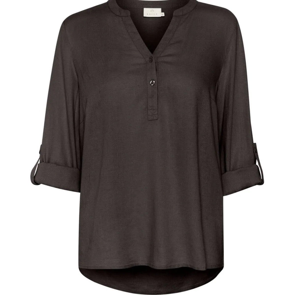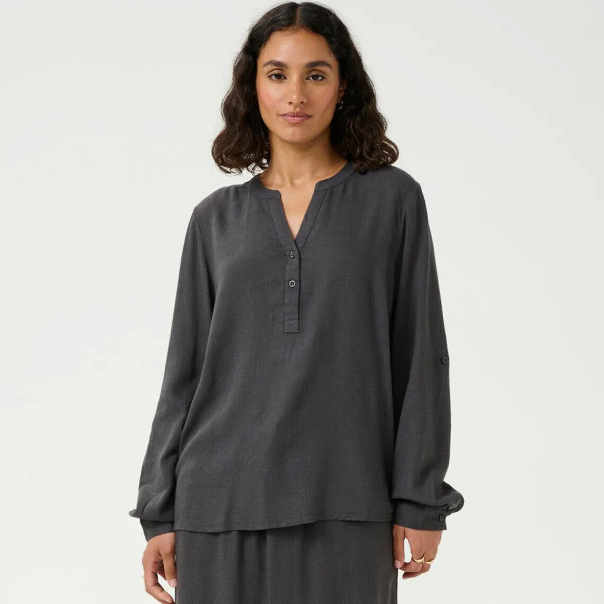 Sie wurde aus einem hochwertigen Mischgewebe in Schwarz gefertigt. Besonders gefällt uns der große Anteil an Leinen. So kannst du sie auch an warmen Tagen tragen, da sie angenehm luftig und leicht ist. Der V-Ausschnitt ist zusätzlich mit einer Knopfleiste verziert. Die langen Ärmel sind locker und mit einer Manschette versehen. Zusätzlich sind Rollmanschetten vorhanden, so kann sie auch lässig mit einem 3/4 Ärmel getragen werden. Im Rücken ist eine Passe mit Falten eingearbeitet. Diese bieten dir zusätzliche Bewegungsfreiheit. Der Regular Fit Schnitt rundet das perfekt ab. Eine bequeme und gut zu kombinierende Bluse für den Frühling und Sommer.