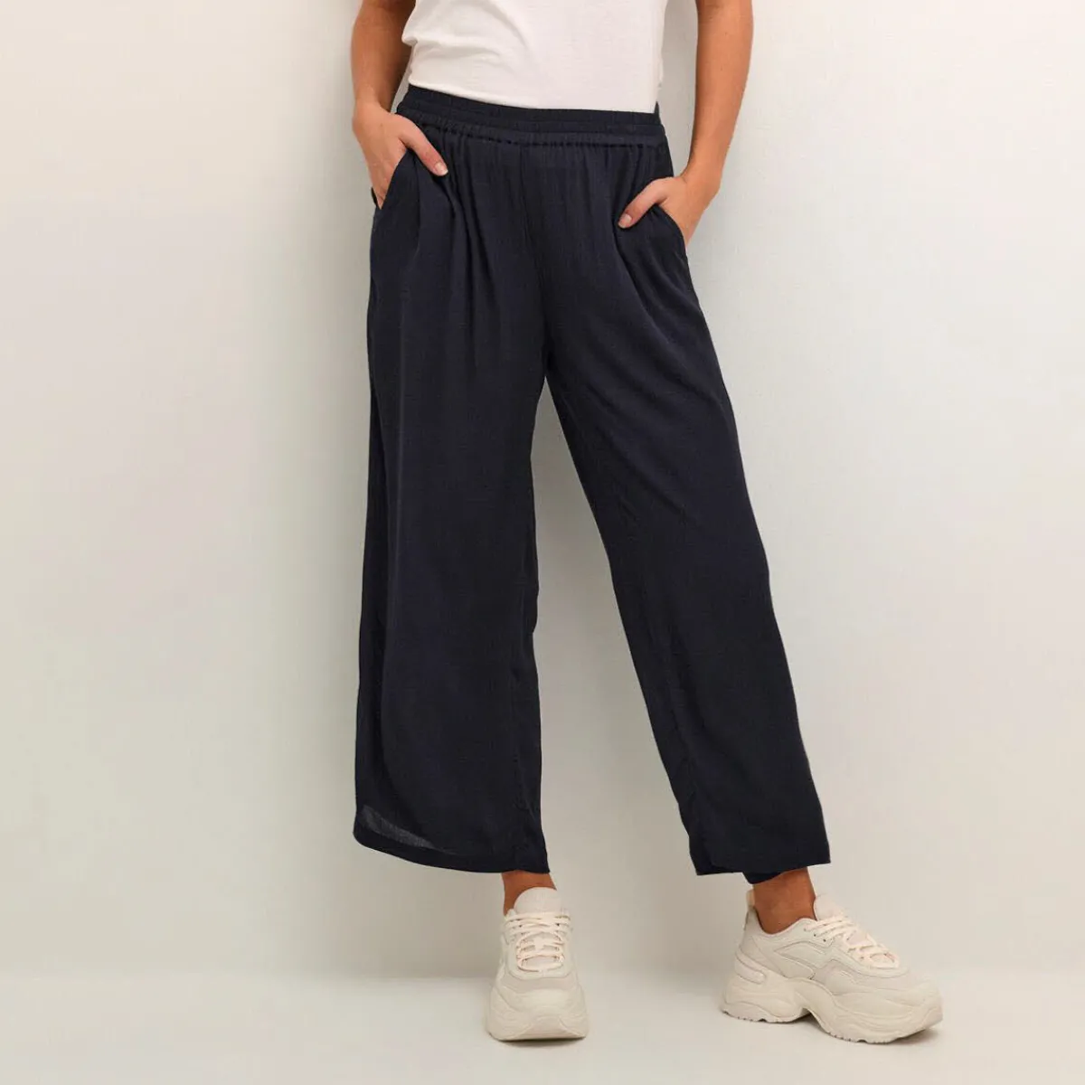 Der leichte Viskose Stoff in Blau ist fließend und luftig gearbeitet. Durch ihren Loose Fit Schnitt, den durchgehenden Gummibund an der Taille und den Seitentaschen ist sie super bequem zu tragen. Auch dieses Modell ist an der modernen Knöchellänge gearbeitet.