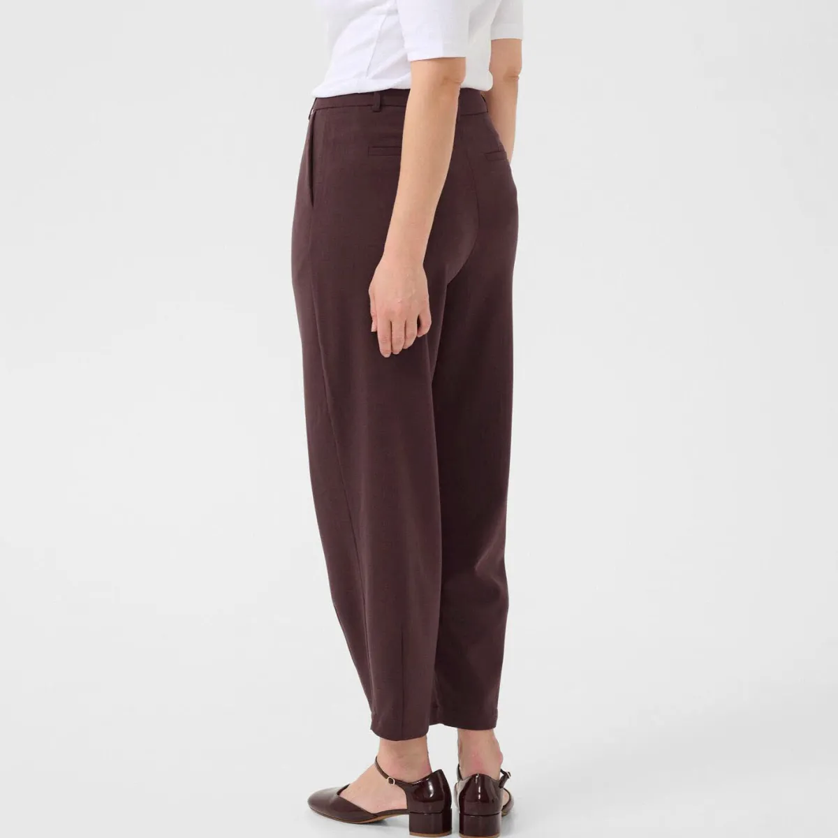 Der gewebte Stoff in Braun Aubergine, hat eine reguläre Passform, mit hoher Taile und der angesagten Knöchellänge.