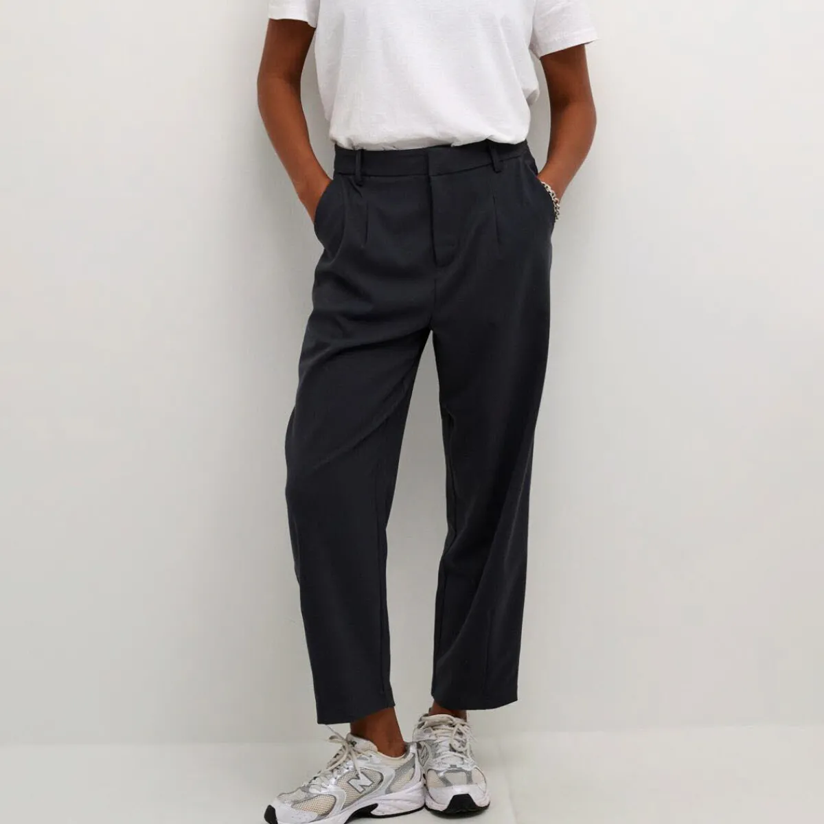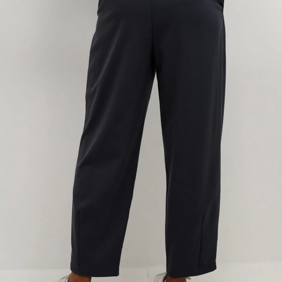 Der gewebte Stoff in Schwarz, hat eine reguläre Passform, mit hoher Taile und der angesagten Knöchellänge.