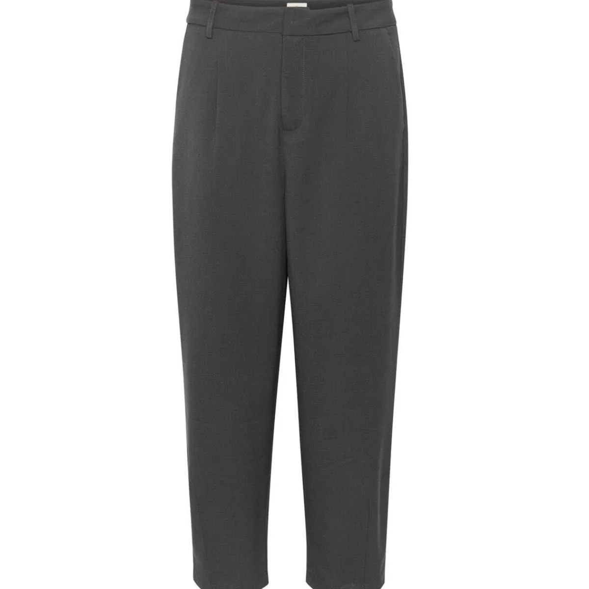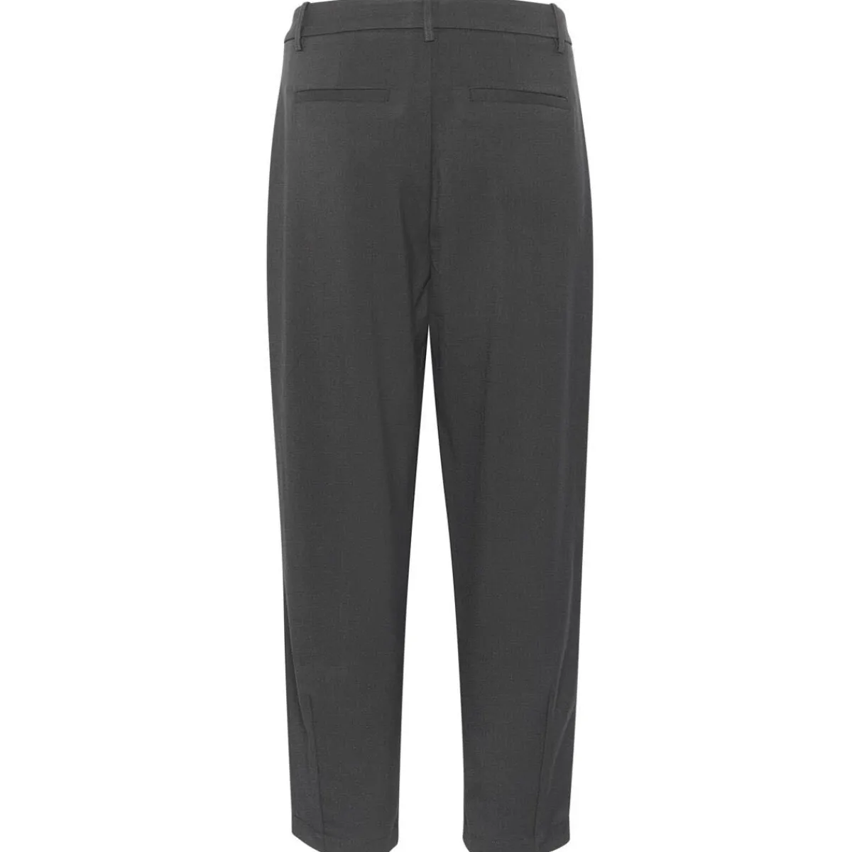 Die Hose ist mit Gürtelschlaufen, Bundfalten und seitlichen Taschen gearbeitet. Auf dem Gesäß sind Paspeltaschen eingearbeitet.