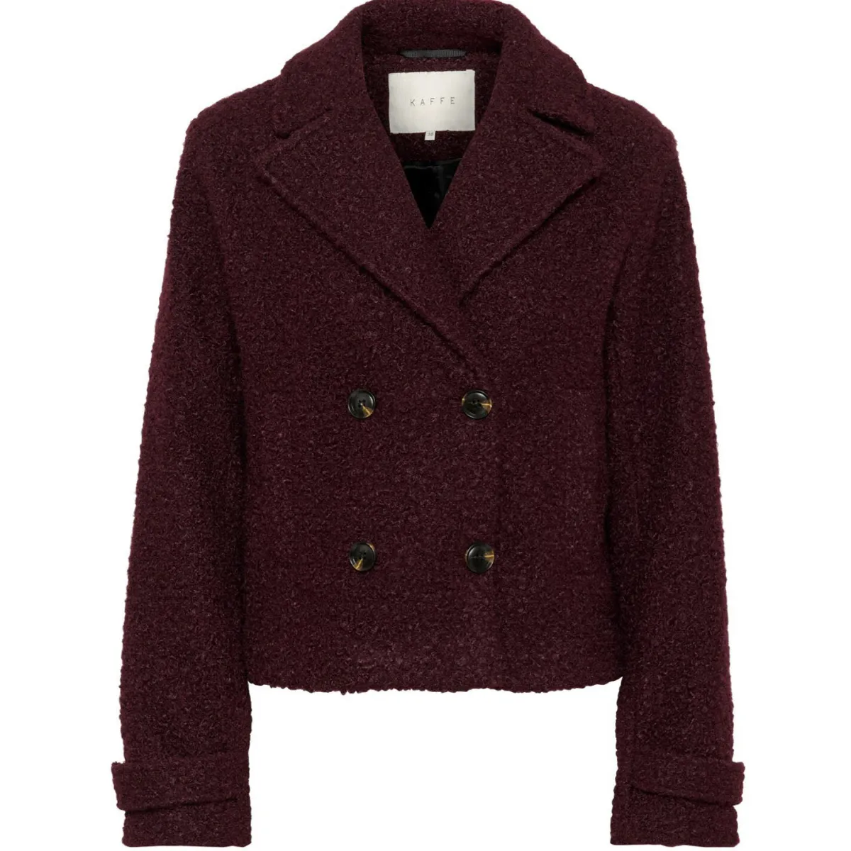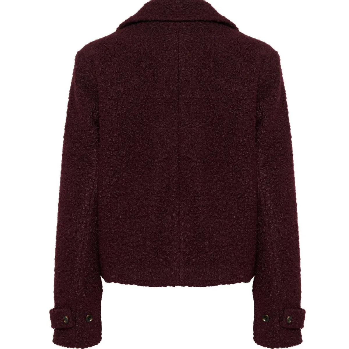 Das Material ähnelt einem Bouclestoff und ist besonders kuschlig. Mit ihrem breiten Reverskragen und dem doppelt geknöpften Verschluss, harmoniert sie perfekt zu jedem Outfit. Ob nun eine weit geschnittene Jeans oder elegant zum Rock.
