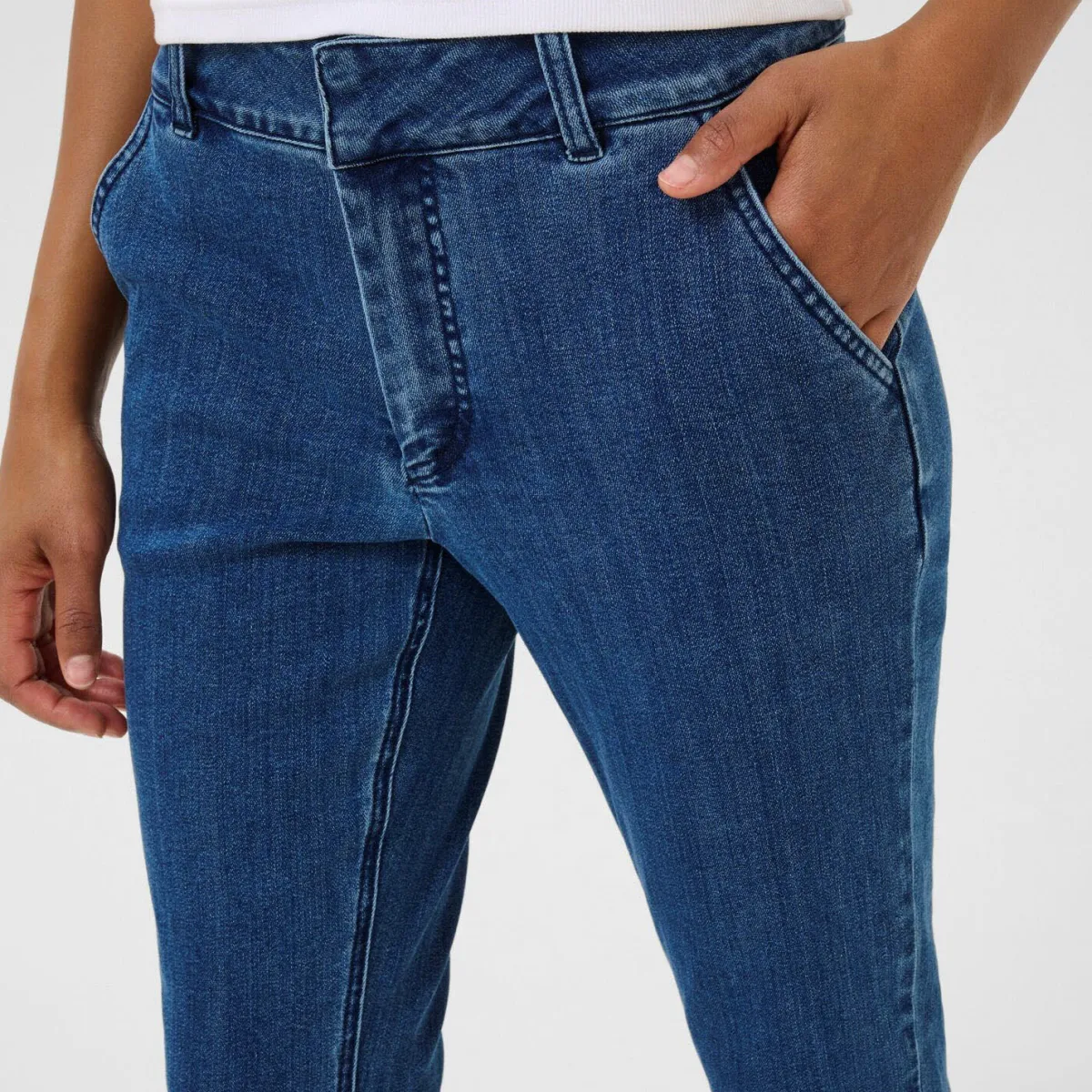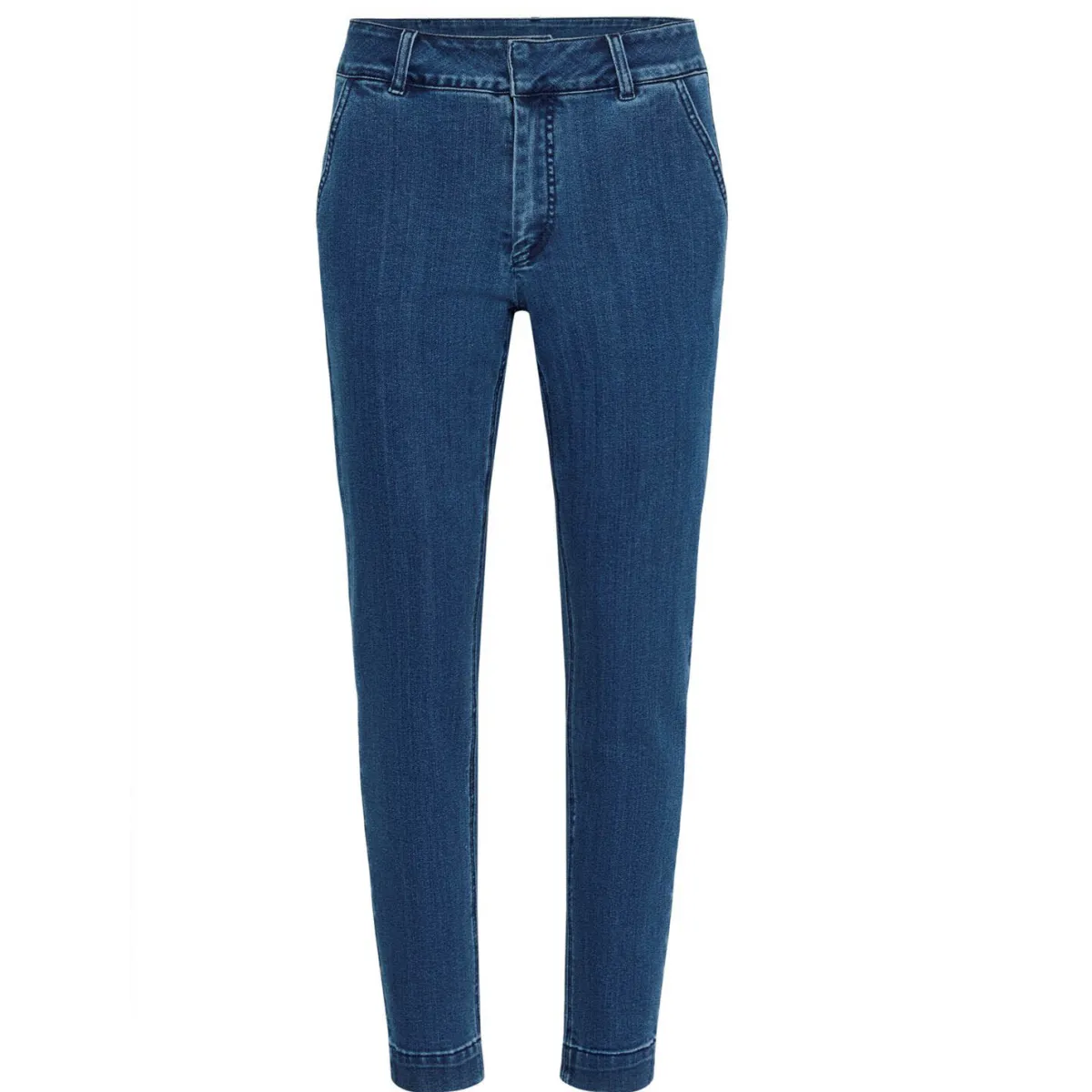 Der Denim Stoff in Blau lässt sich super kombinieren. Die Jeans ist Regular Fit geschnitten und hat schmale Beine. Sie hat seitliche Taschen und auf dem Gesäß zwei Paspeltaschen. Sie wird mit einem Riegel und Reißverschluss geschlossen und besitzt Gürtelschlaufen.