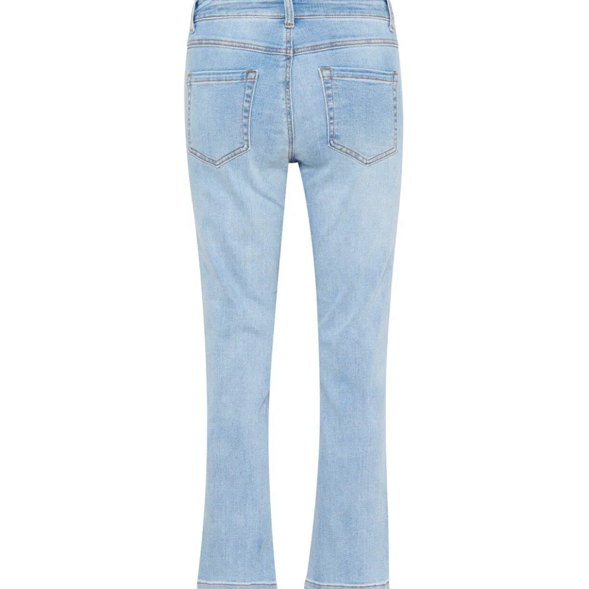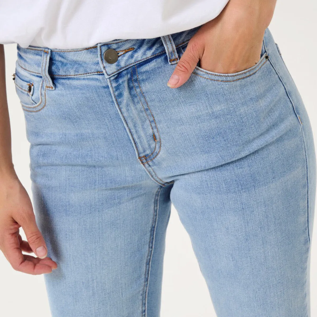 Der helle Denim Stoff in Blau lässt sich super kombinieren. Die Hose hat einen Regular Fit Schnitt. Einen Bund mit Gürtelschlaufen und die typischen 5 Taschen. Und das leicht ausgestellte Bein mit Knöchellänge verleiht ihr einen besonderen Look.