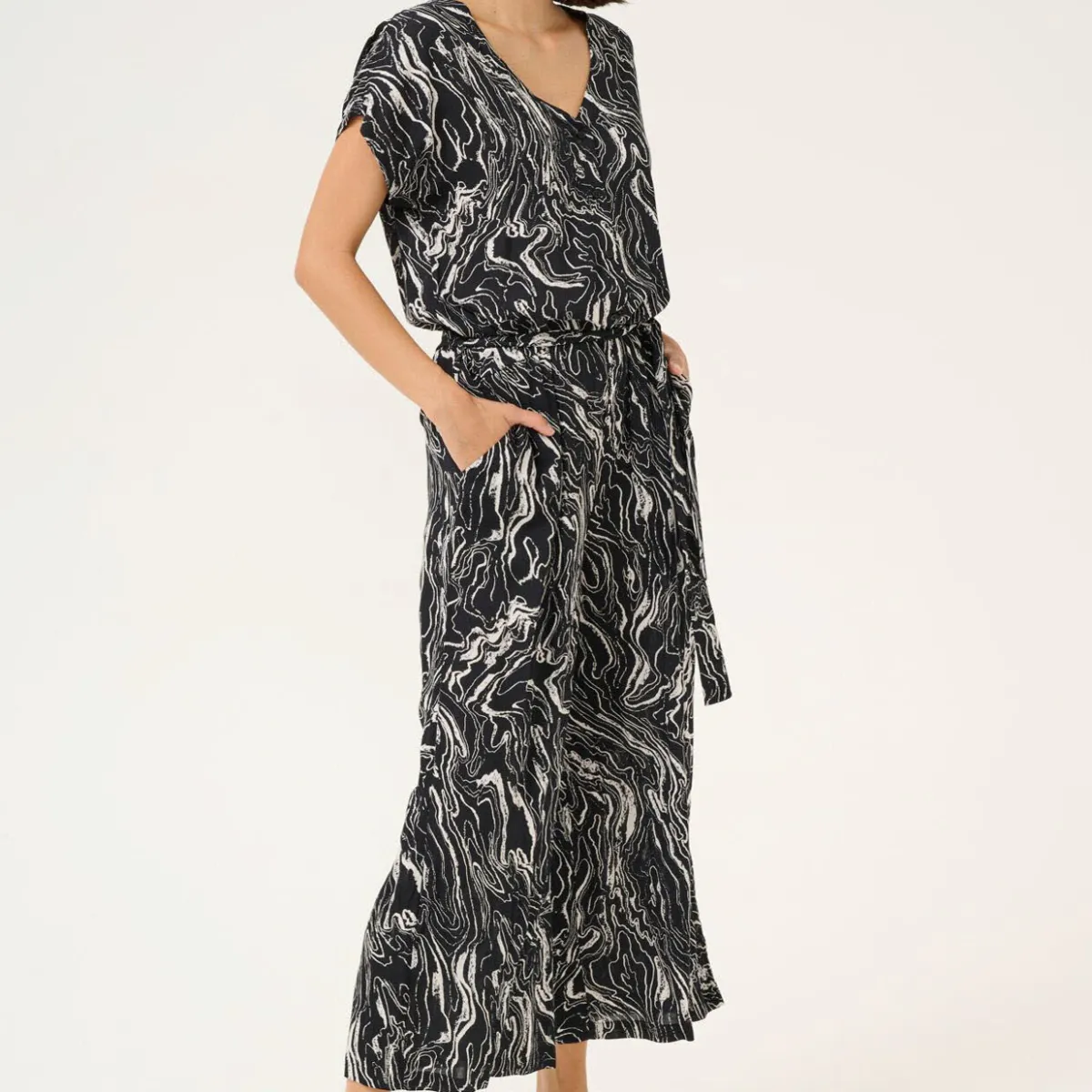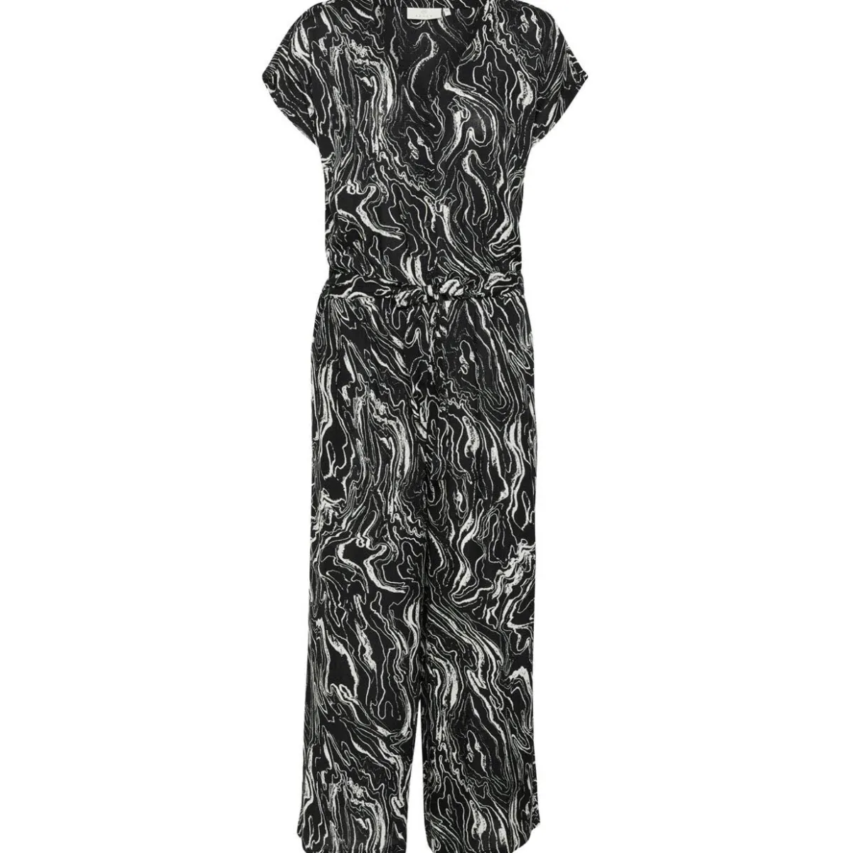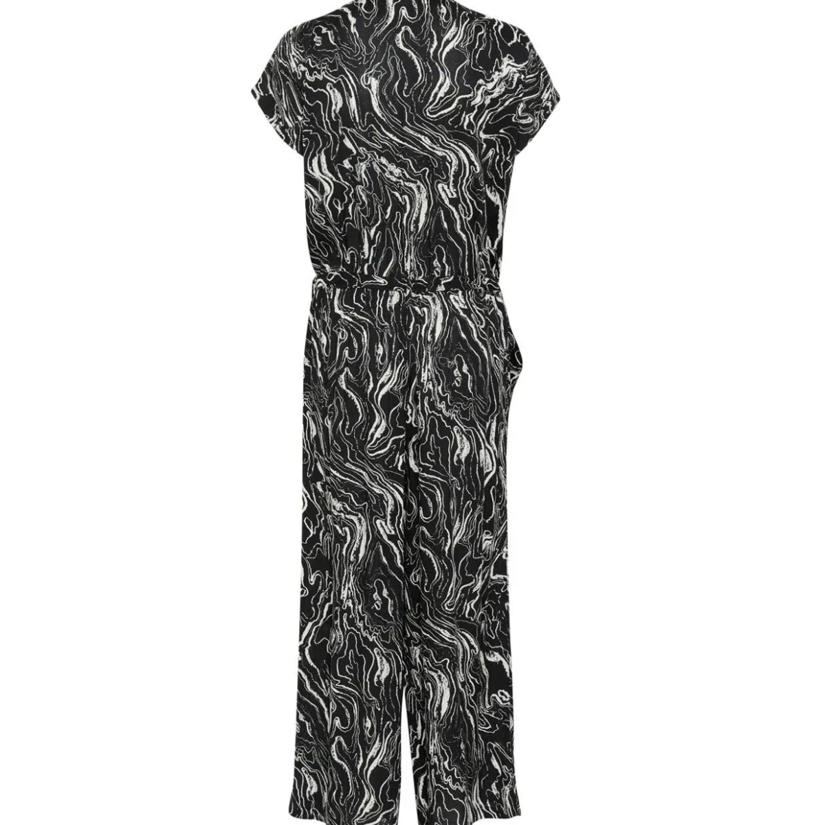 Der leichte Viskose Stoff in Schwarz ist mit einem individuellen Muster mit Weiß versehen. Der Jumpsuit hat kurze Ärmel und einen V-Auschnitt.