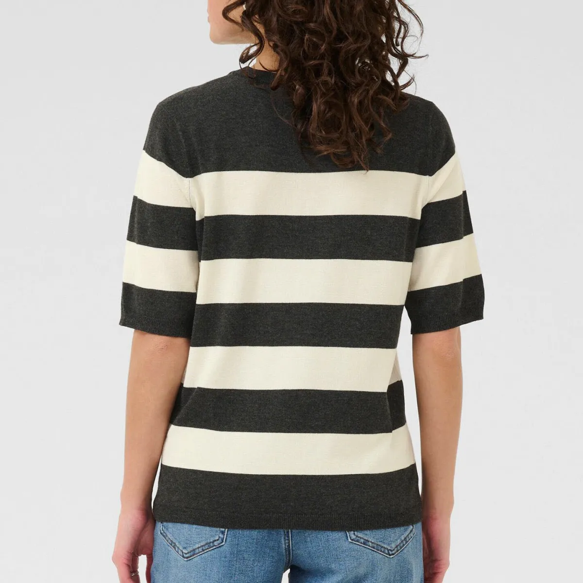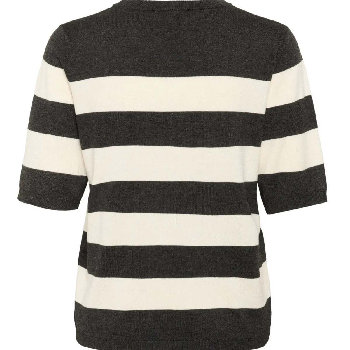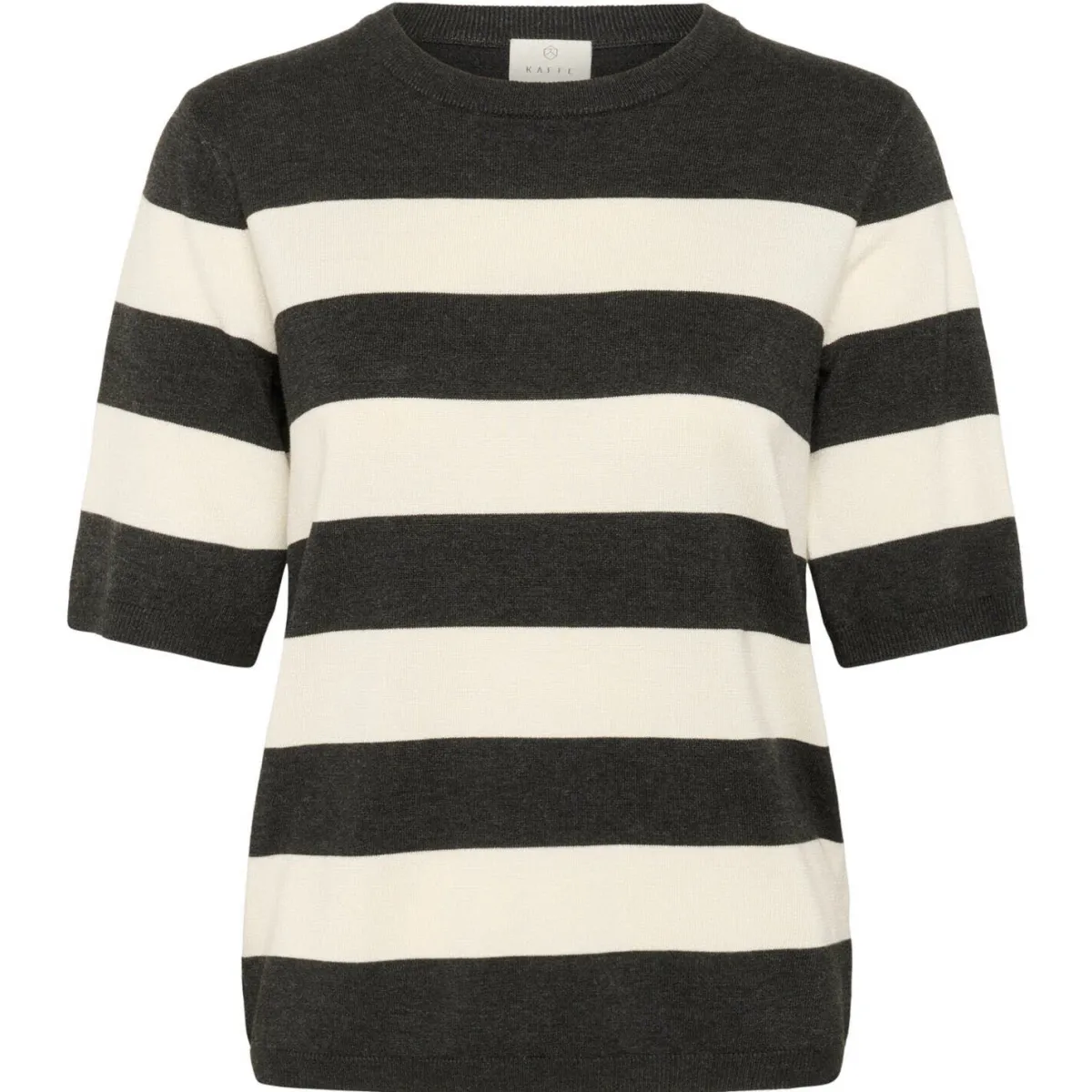 Das feine Strickgewebe im modischen Streifenmuster in Schwarz mit Weiß ist mit einem klassischen Rundhalsausschnitt gearbeitet. Dieser und die halblangen Ärmel, sind mit einem breiten Bund versehen und besonders angenehm zu tragen. Er hat einen Regular Fit Schnitt und lässt sich vielseitig kombinieren.