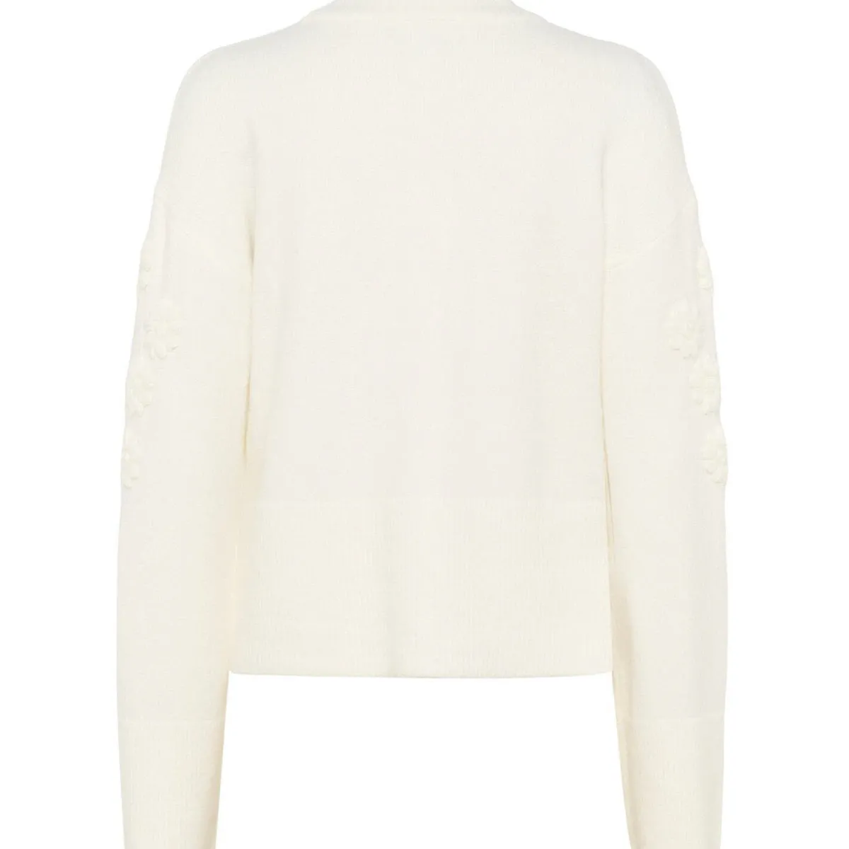 Das weiche Strickgewebe in Weiß ist mit einem Rundhalsausschnitt gearbeitet und hat weite, lange Ärmel. Auf der Vorderseite sind kleine Blumen aufgestickt, die ihm eine verspielte Note verleihen. Er ist mit Seitenschlitzen gearbeitet, diese verleihen zusätzlich eine schöne Optik und machen ihn besonders bequem.