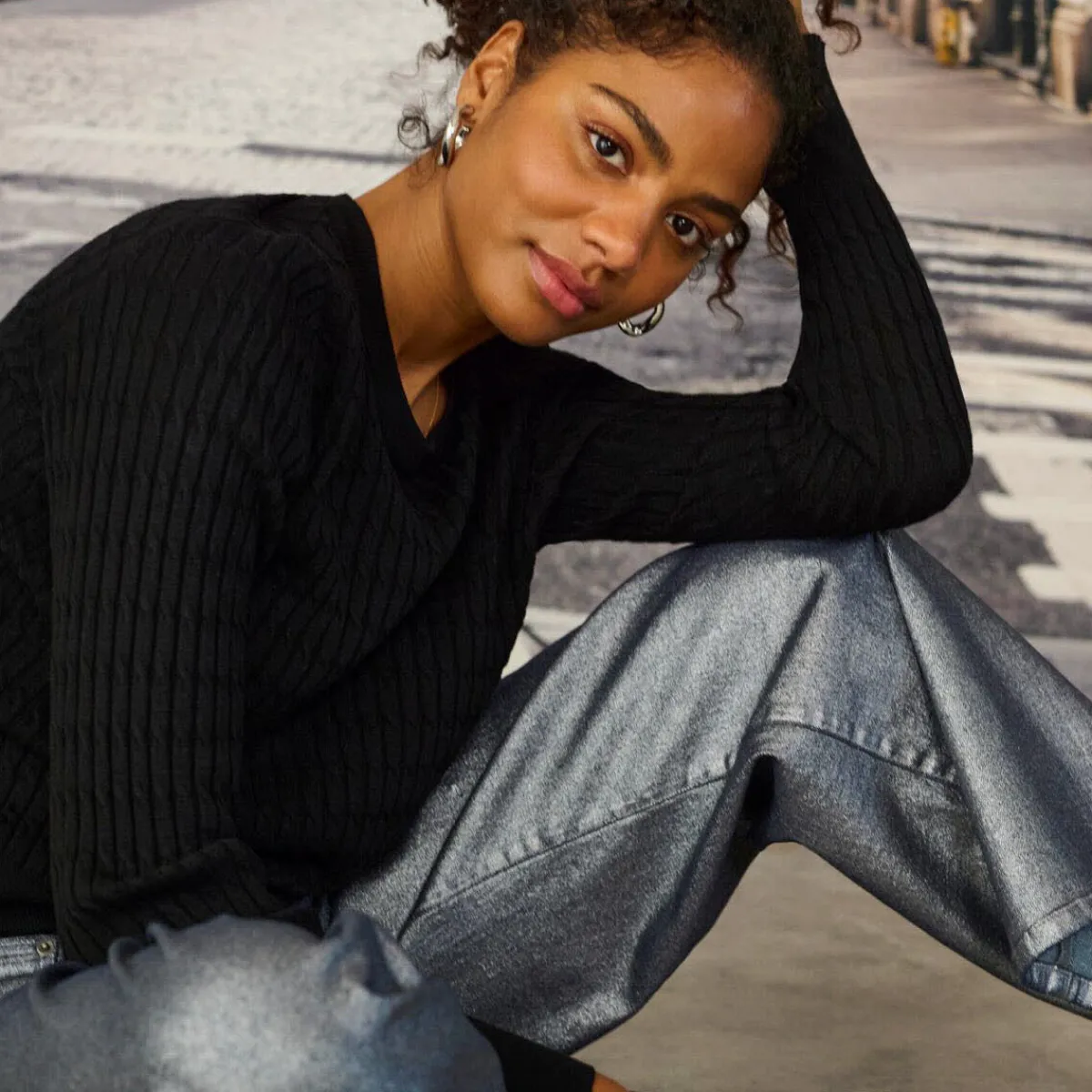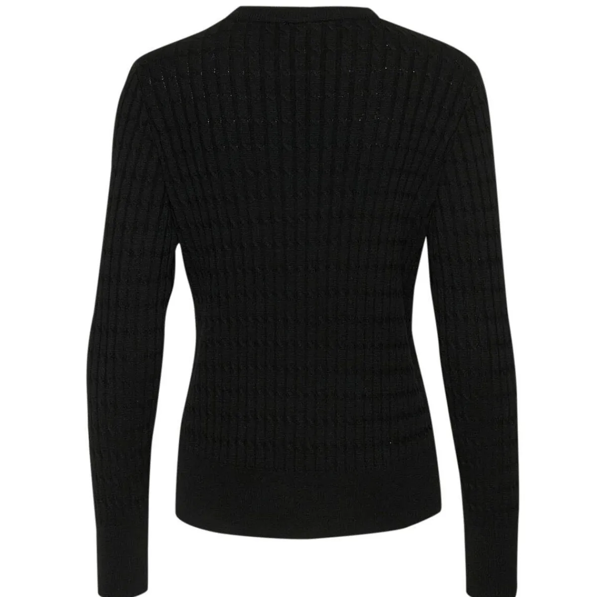 Das Strick Gewebe in Schwarz, ist mit einem Feinripp Muster versehen und etwas schmaler geschnitten. Der Pullover hat einen Rundhals Ausschnitt und komplettiert jedes Outfit, egal ob Hose oder Rock.
