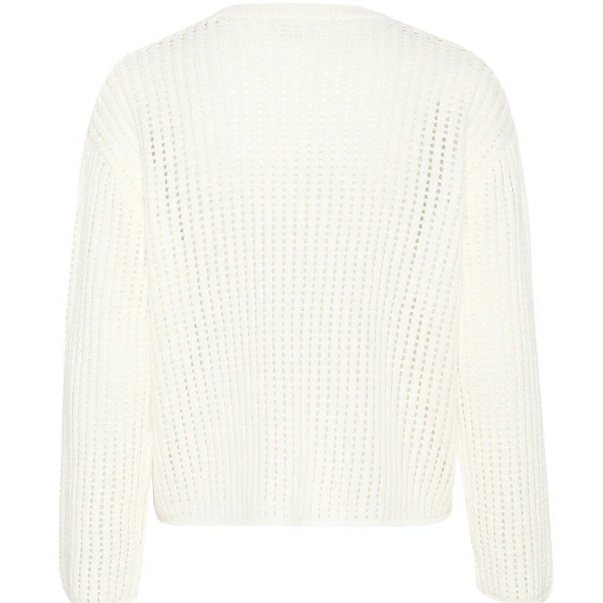 Er wurde aus einem weichen Baumwolle Mischgewebe in Weiß gefertigt und ist mit großen, luftigen Maschen gearbeitet. Er hat einen Rundhalsausschnitt und lange Ärmel.