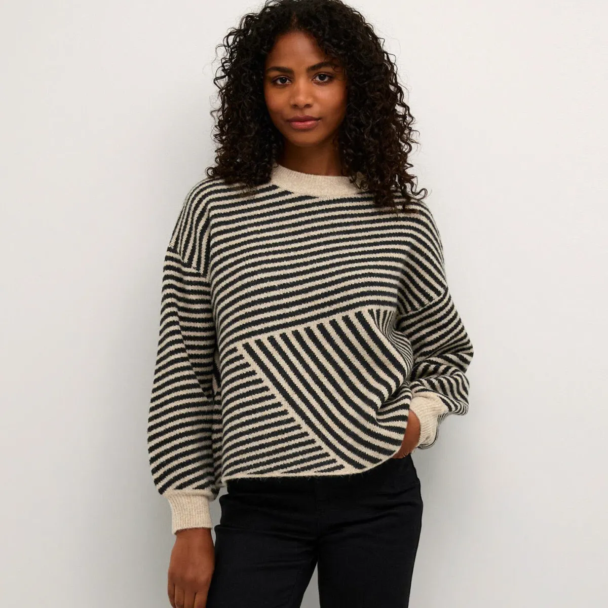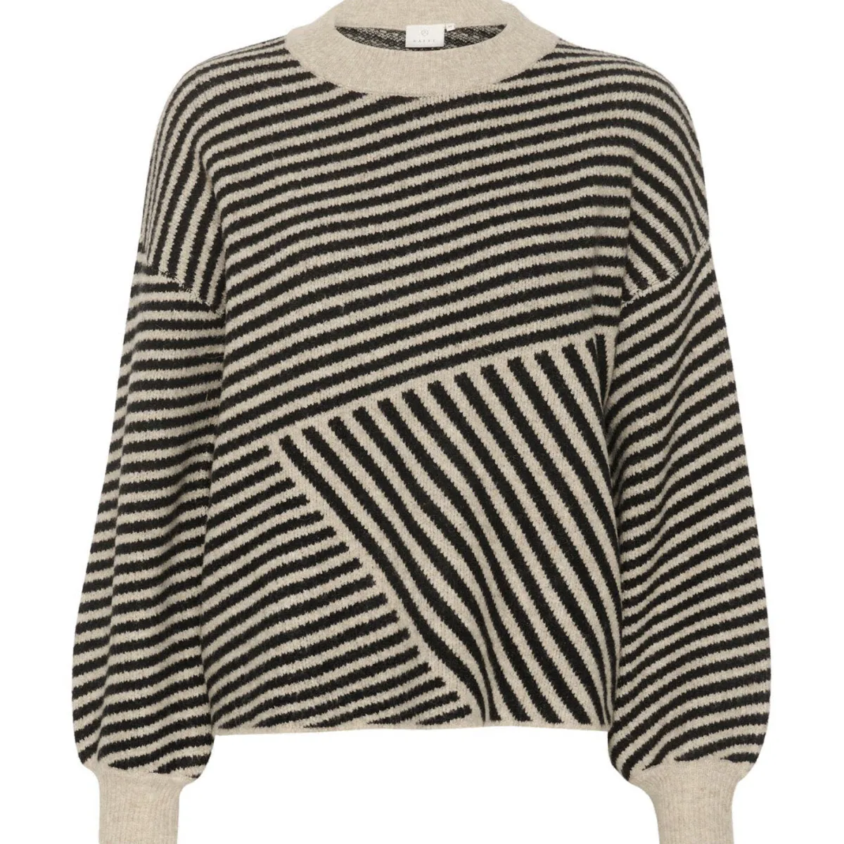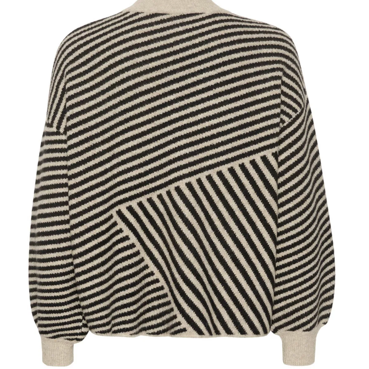 Er fällt durch sein plakatives Streifenmuster in Grau mit Schwarz sofort ins Auge. Er ist mit einem kleinen Stehkragen mit Rippstrick gearbeitet und hat lange Ärmel. Die lockere Passform macht ihn besonders komfortabel.