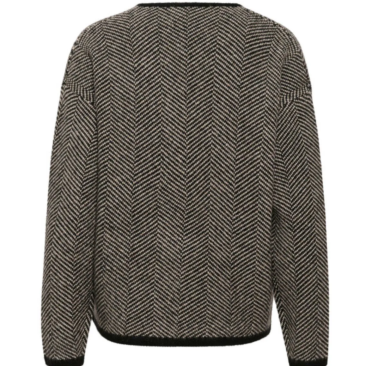 Er begeistert durch seine Pfeffer und Salz Optik in Weiß und Schwarz. Der V-Ausschnitt und die Bündchen, sind Schwarz abgesetzt und verleihen ihm das gewisse Etwas.
