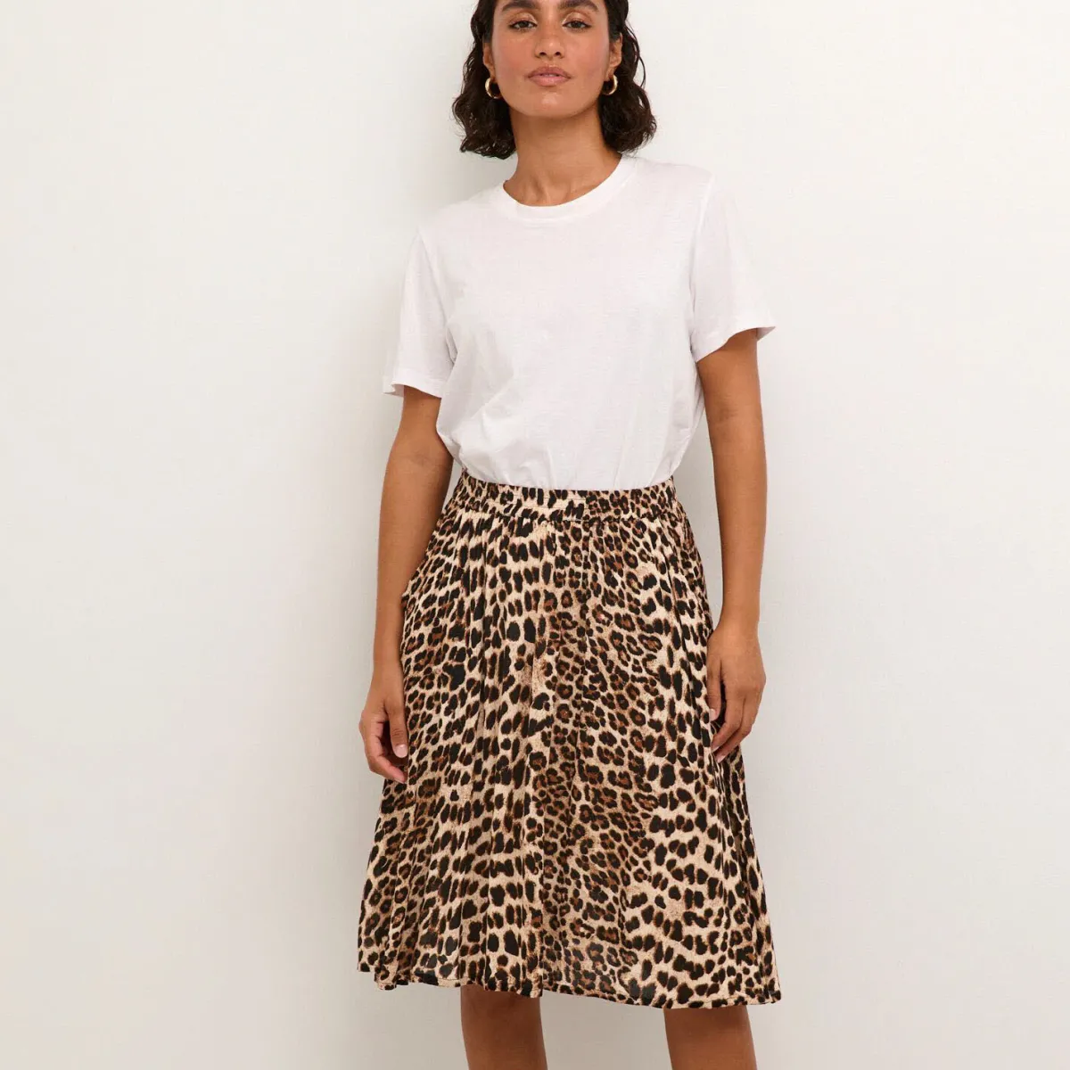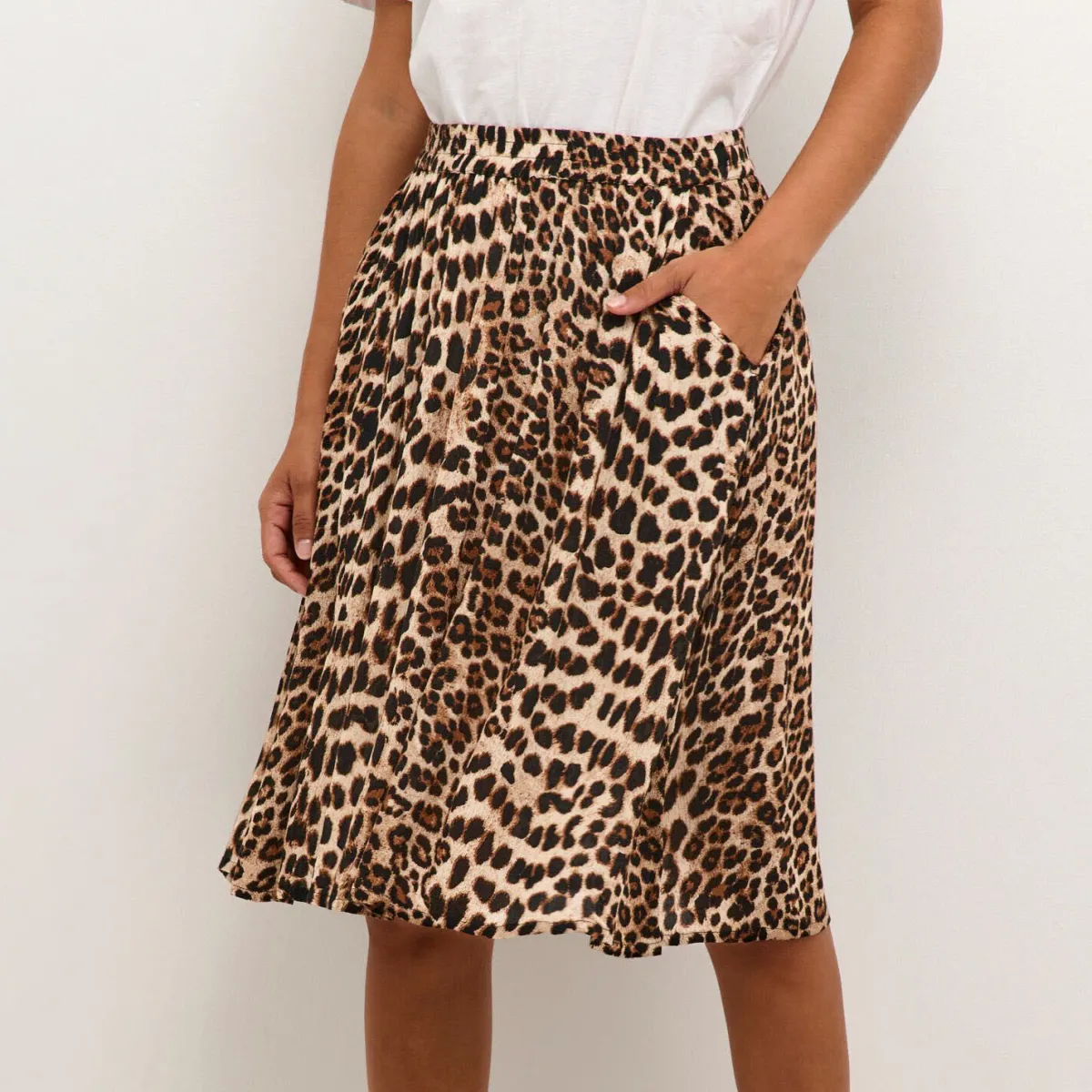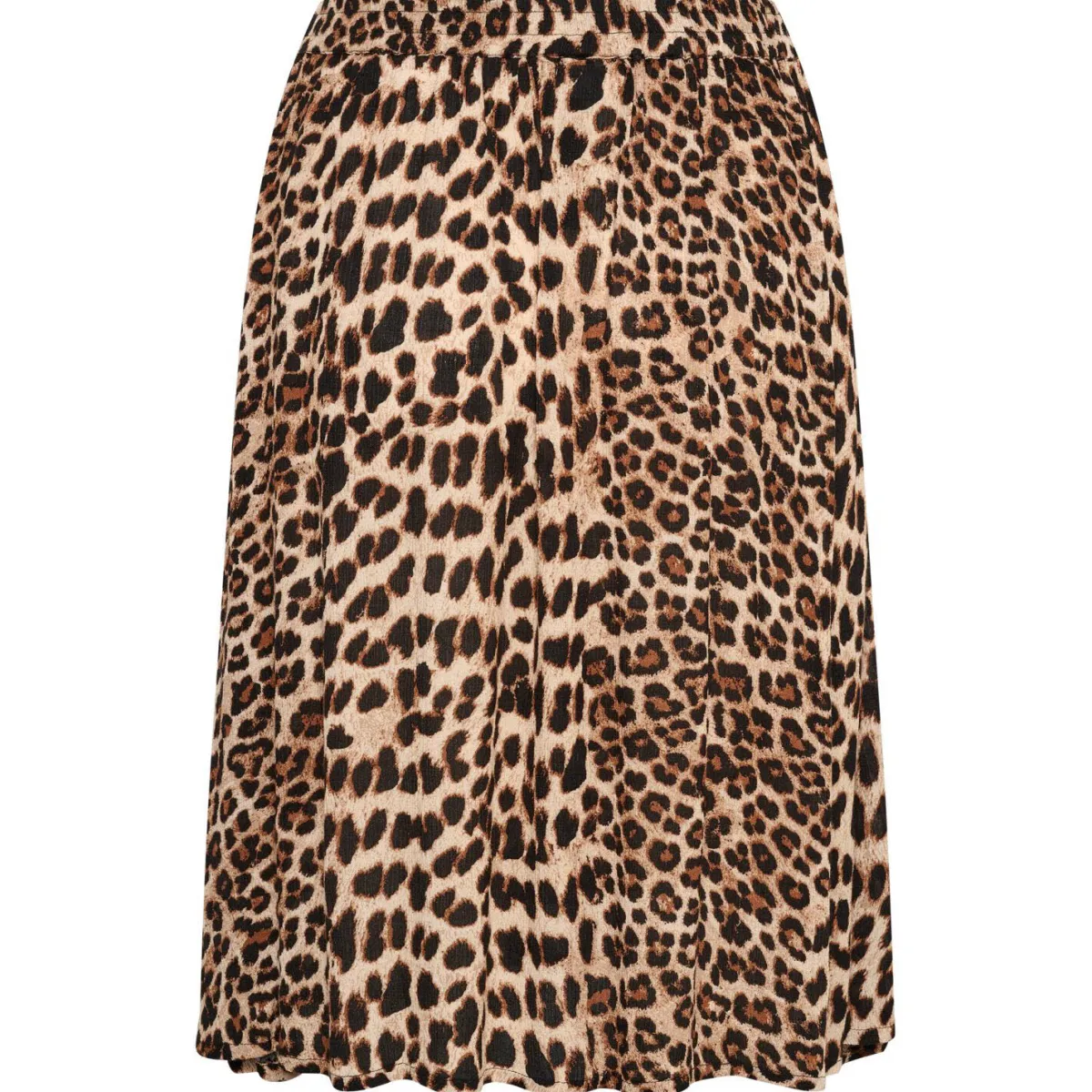 Der leichte Viskose Stoff ist mit einem Leo Animal Print in Braun verziert. Er hat eine elastische Taille und ist in A-Linie gearbeitet. Er hat eine Knielänge und praktische Seitentaschen und für uns ein Must Have für den Sommer den du super kombinieren kannst.
