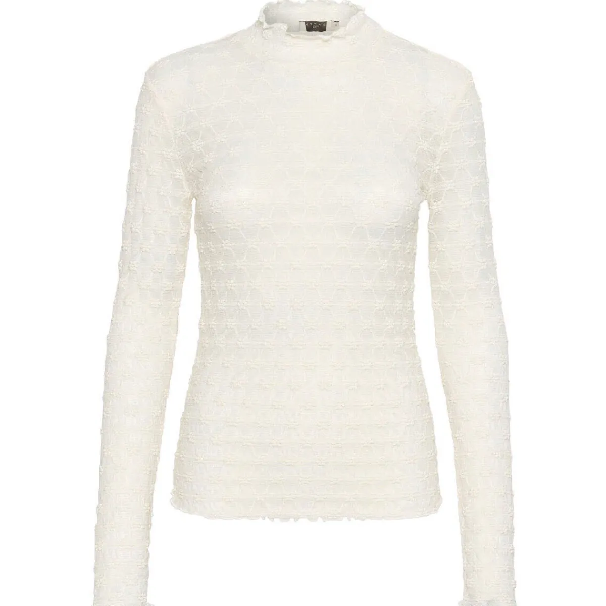 Das Highlight ist hier das Mesh Gewebe in Creme Beige, welches mit kleinen Blumen beflockt wurde. Es hat lange Ärmel und einen kleinen Stehbund am Hals.