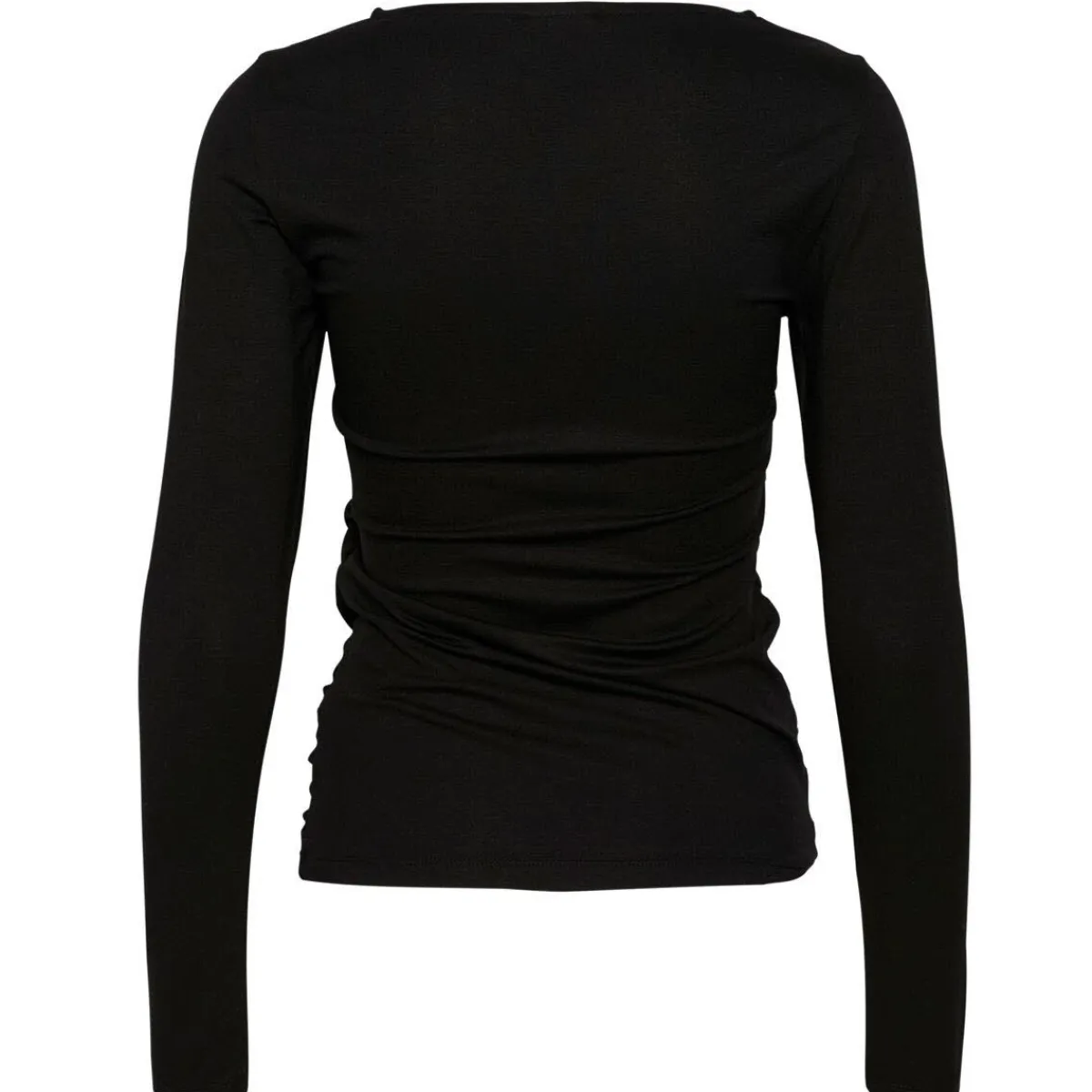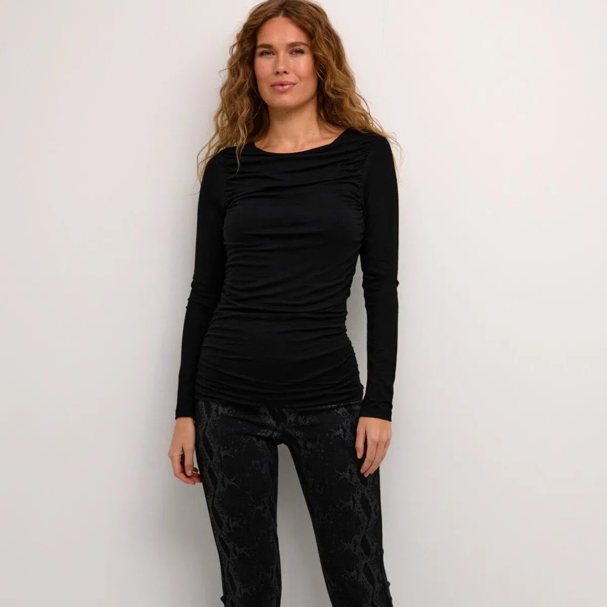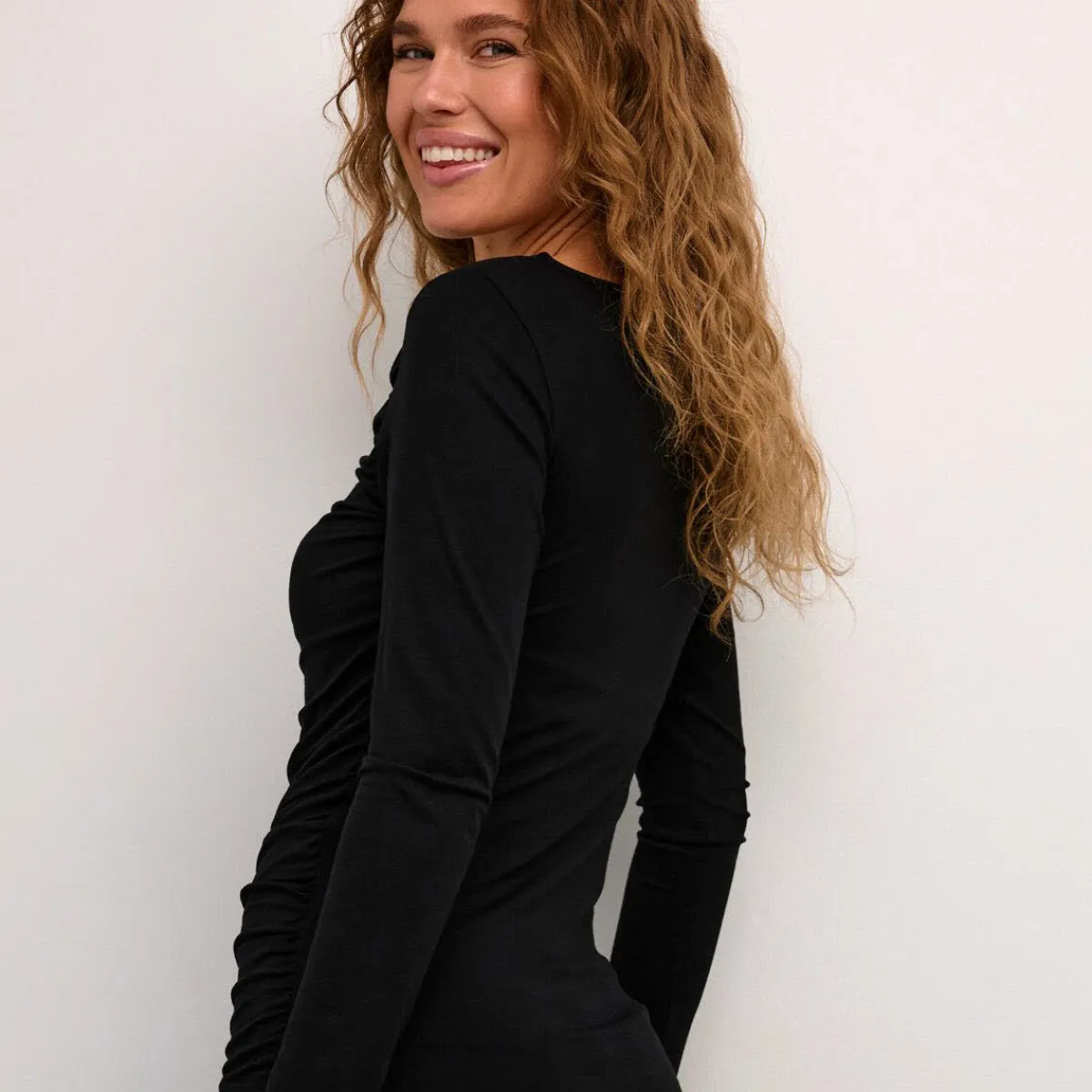 Das Mischgewebe in Schwarz ist auf mit kleinen Raffungen versehen, wodurch eine schöne Faltenbildung entsteht. Trotz das es Slim Fit geschnitten ist, schmeichelt es jeder Figur.