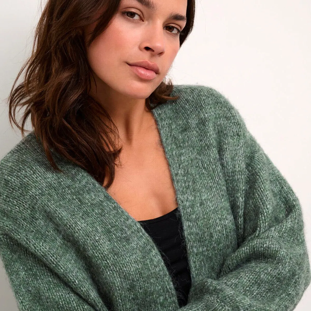 Das Strickgewebe in Grün passt super zu jedem Outfit.