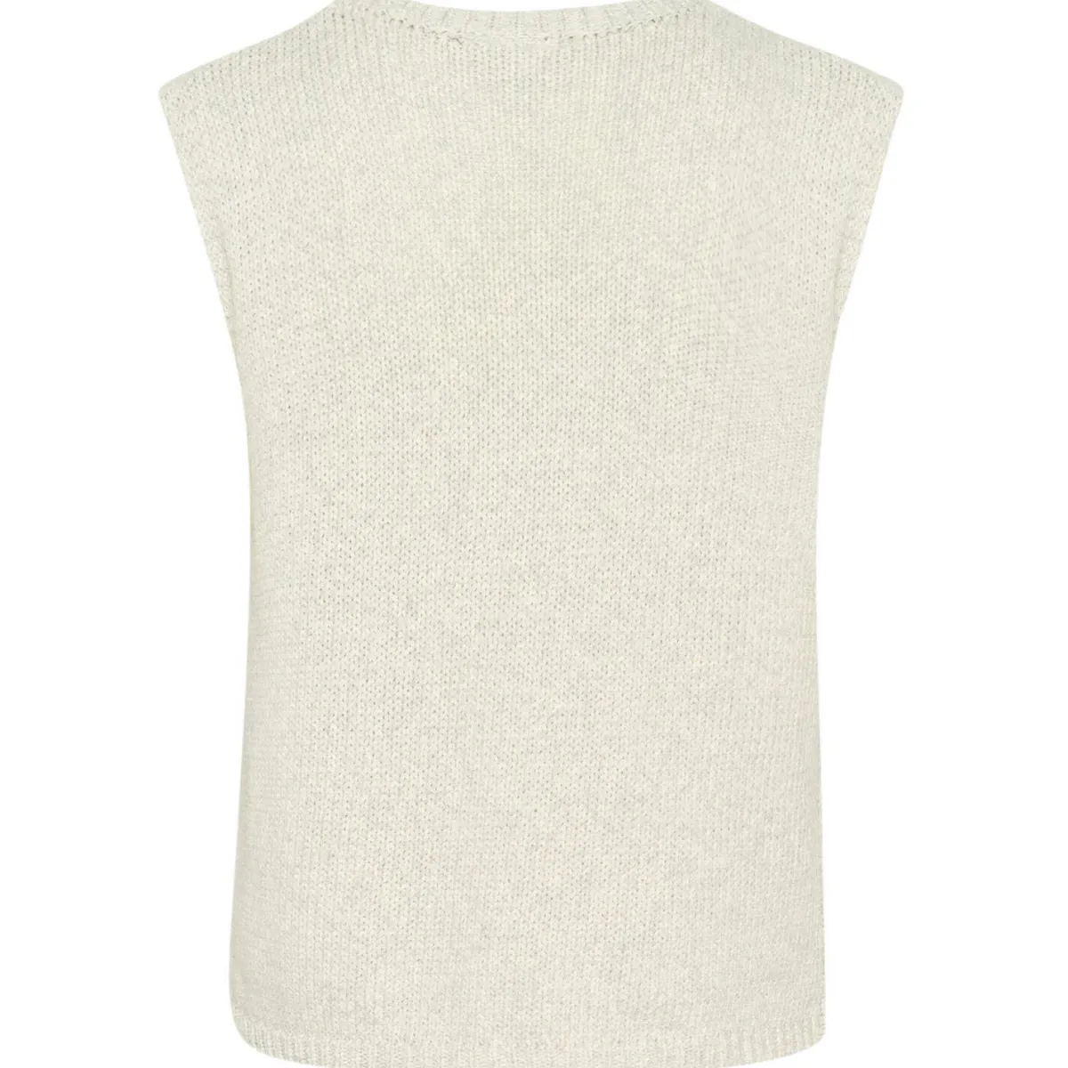 Die Strickjacke ohne Ärmel in Beige hat einen tiefen V-Ausschnitt und wird vorne mit kleinen Schleifen gebunden.