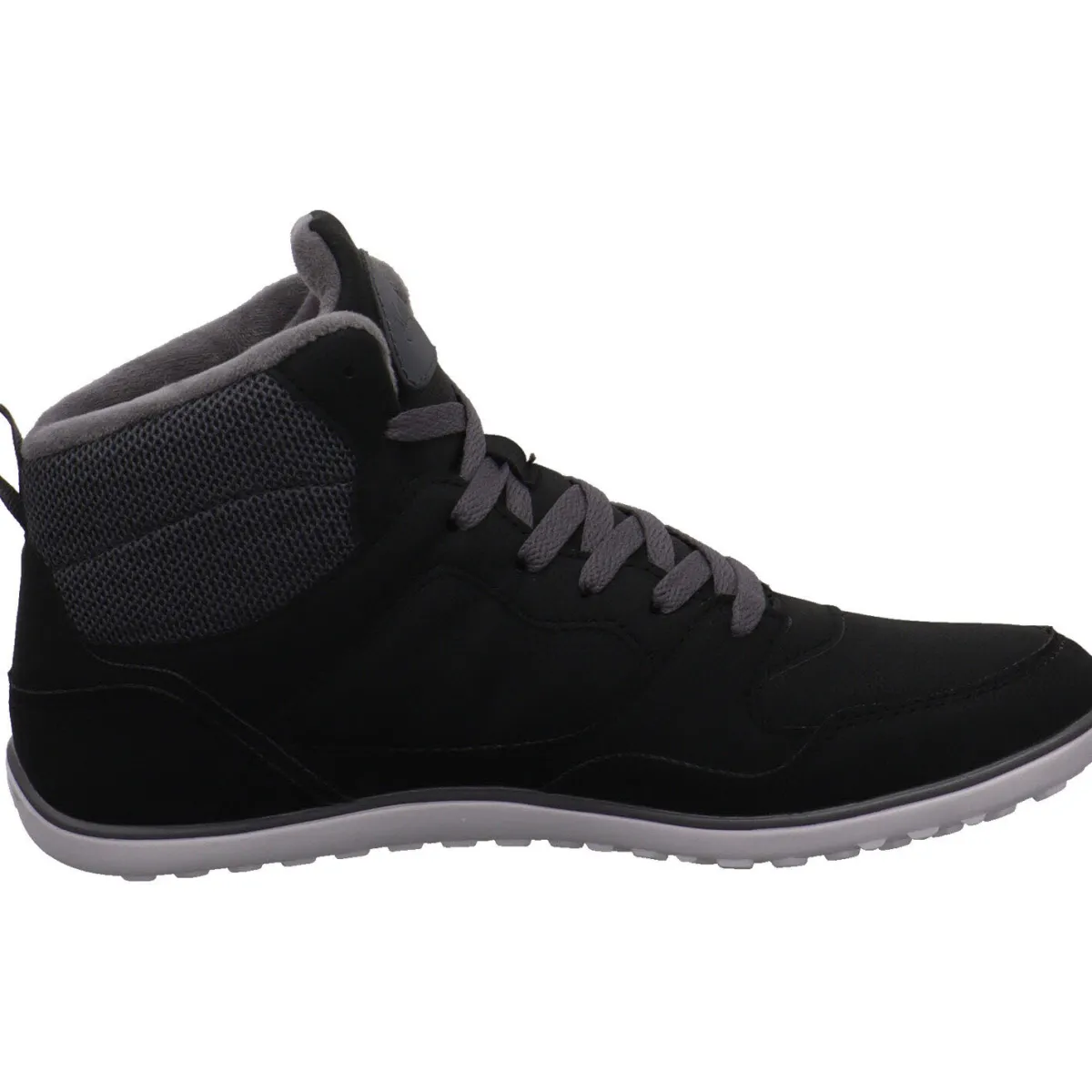 Das Barefoot Modell wurde aus Kunstleder in Schwarz und Grau gefertigt. Durch die Schnürung und der Lasche am Schaft ist der Einstieg ganz einfach.