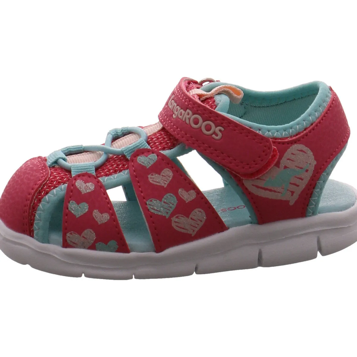 Die verstärkte Schuhspitze schützt die Zehen auch auf unwegsamem Gelände und durch den Klettverschluss und die Gummischnürung lässt sich die Sandale perfekt den Kinderfüßen anpassen.