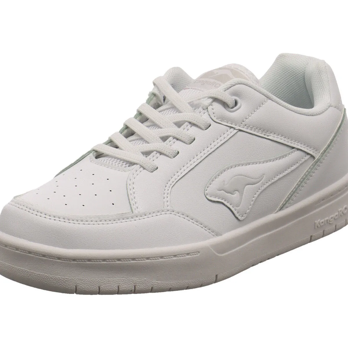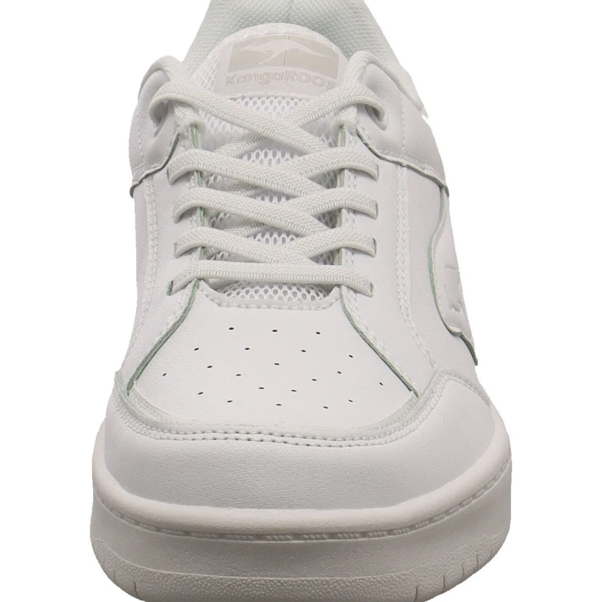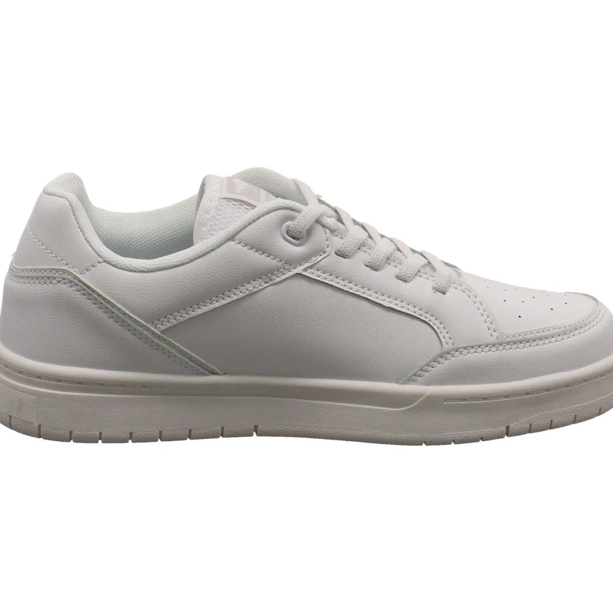 Gefertigt aus Kunstleder in Weiß, ist er auf dem Blatt mit kleinen Lasercuts versehen. Tonale Ziernähte, die Overlay Optik und das Markenlogo an der Seite geben dem Schuh seinen modernen Look.