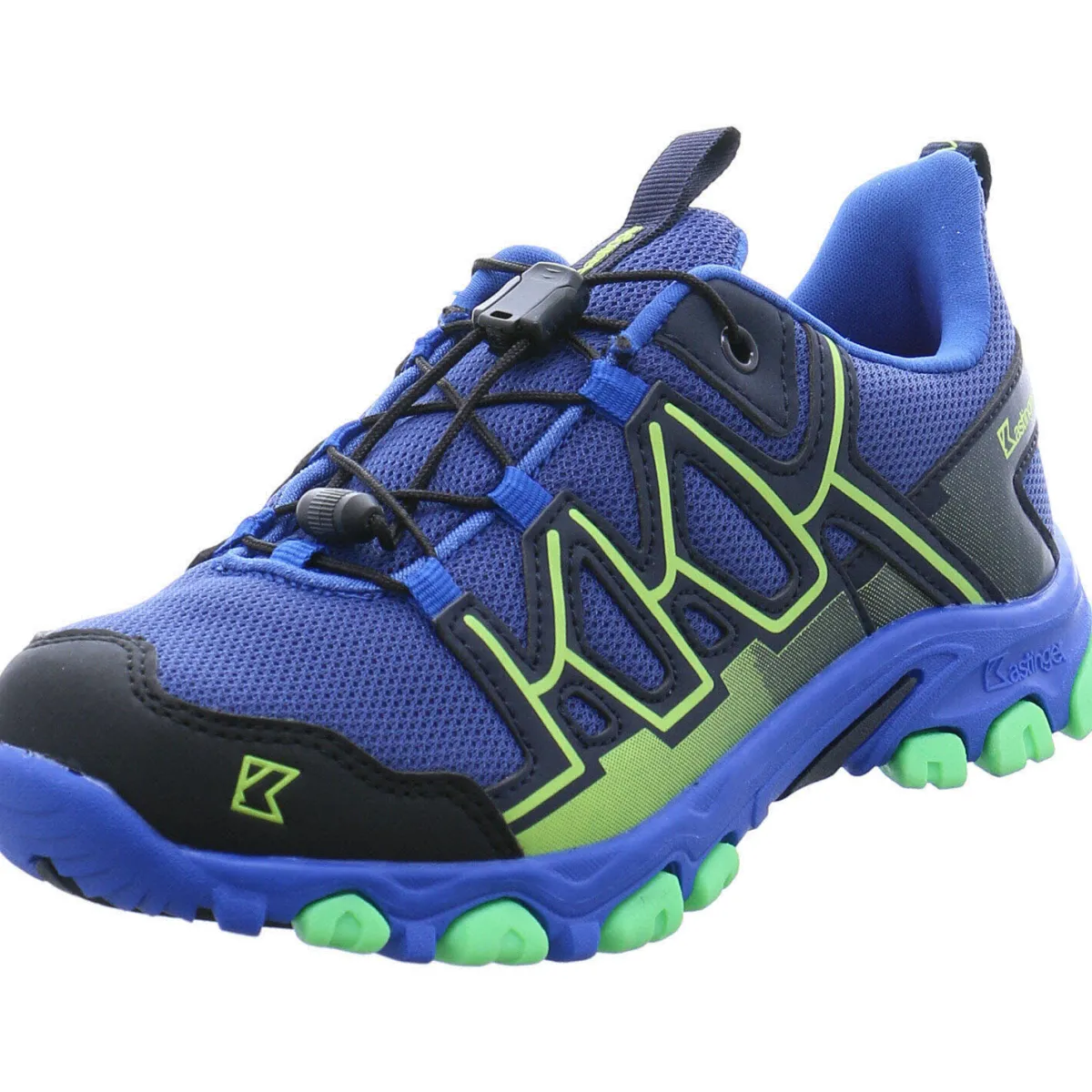 Gefertigt aus einem Mix aus Kunstleder und Textil Mesh in Blau, Schwarz und Grün ist die Schuhspitze und Ferse verstärkt, wodurch der Schuh besonders robust ist.