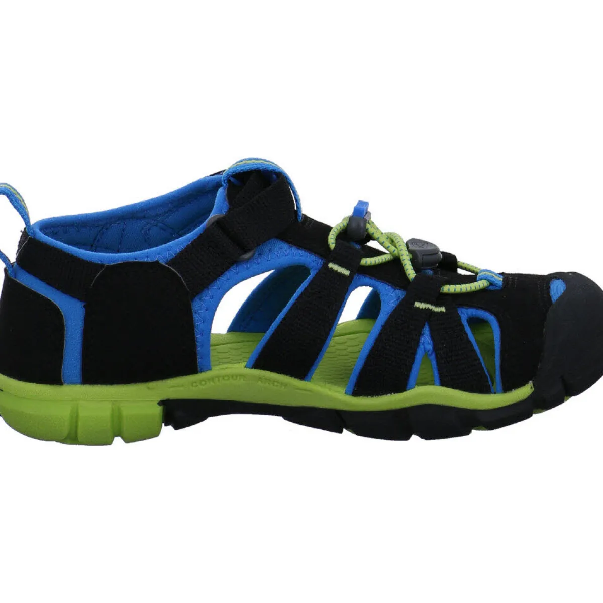 Dank des atmungsaktiven, wasserfesten und waschbaren Obermaterials in einer Kombination aus Funktionstextil und Kunstleder in Veloursoptik in Schwarz mit Blau macht diese Sandale jedes Outdoor Abenteuer mit.