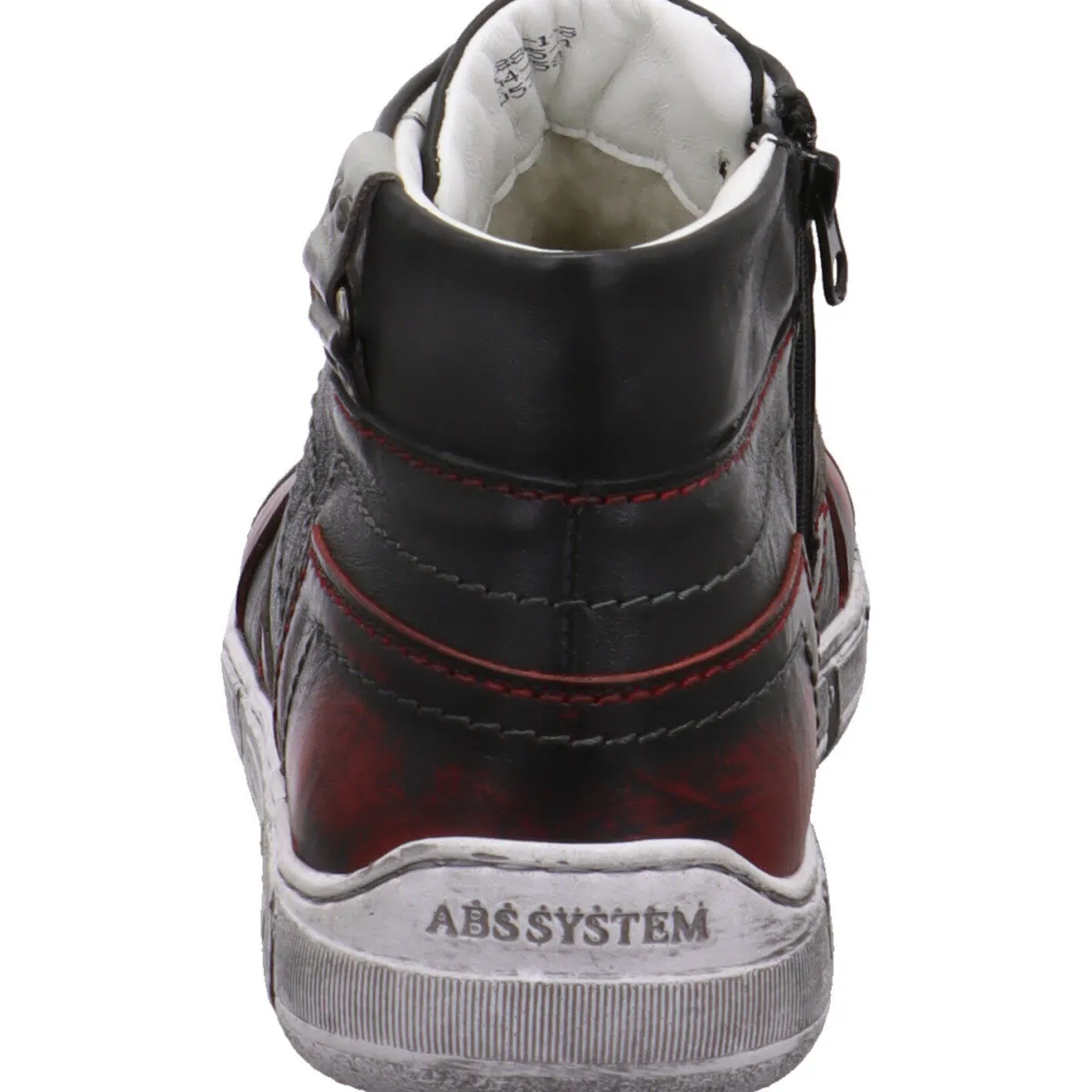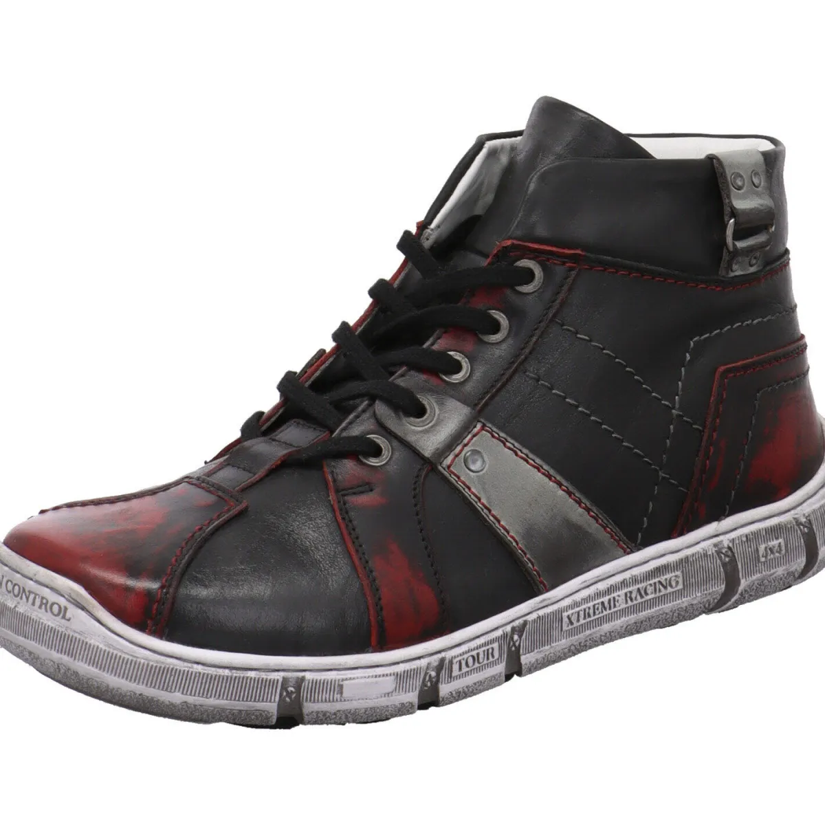 Das soft weiche Obermaterial aus Echtleder in Schwarz und Rot wird durch Parts in Grau und dekorative Ziernähte optisch noch aufgewertet.