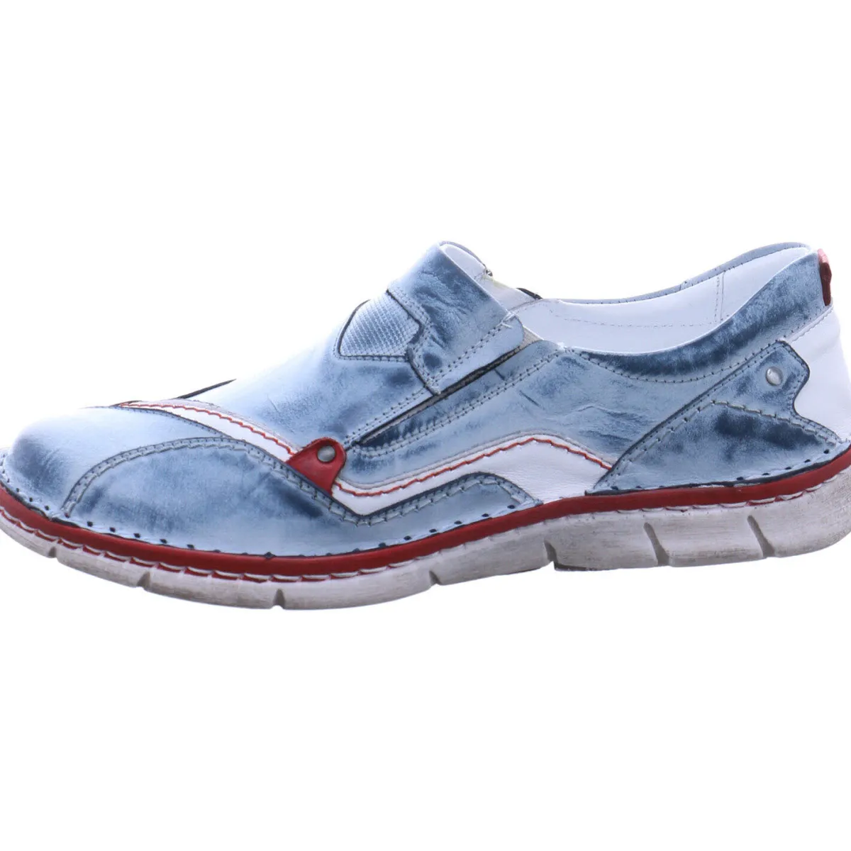 Das Obermaterial aus hochwertigem Echtleder in Blau im Antik Look ist verziert mit auffälligen Nähten, Prägungen und Overlays, die dem Schuh ein cooles Design verleihen. Ein weiterer Eyecatcher ist die Umrandung der Laufsohle und Ziernaht in Rot.