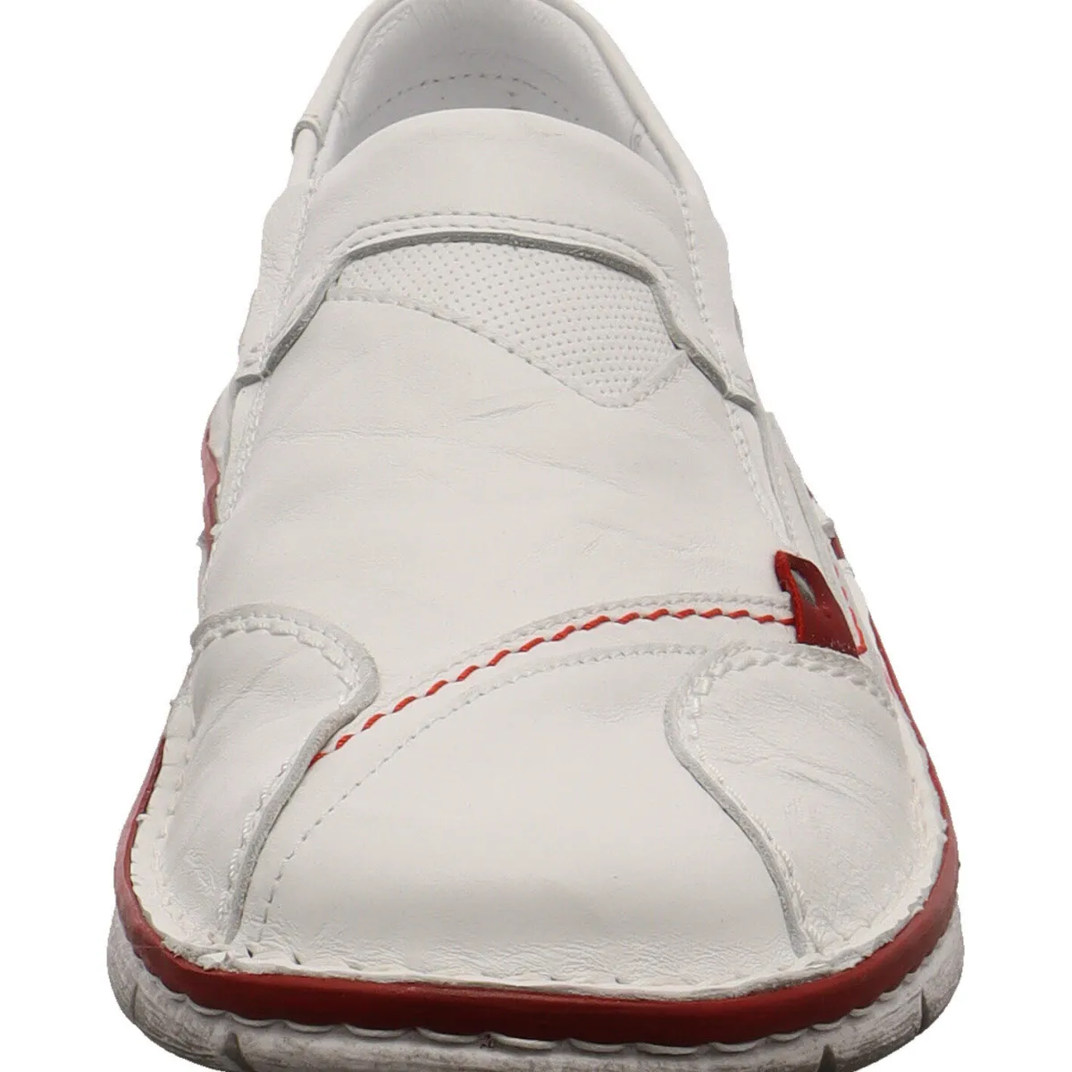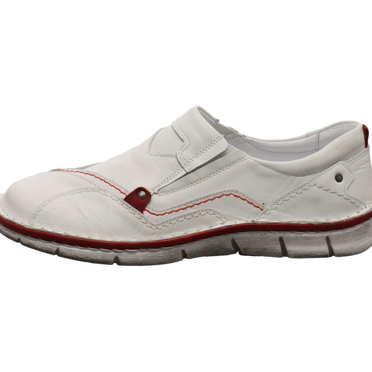 Das Obermaterial aus hochwertigem Echtleder in Weiß im Antik Look ist verziert mit auffälligen Nähten, Prägungen und Overlays, die dem Schuh ein cooles Design verleihen. Ein weiterer Eyecatcher ist die Umrandung der Laufsohle und Ziernaht in Rot.