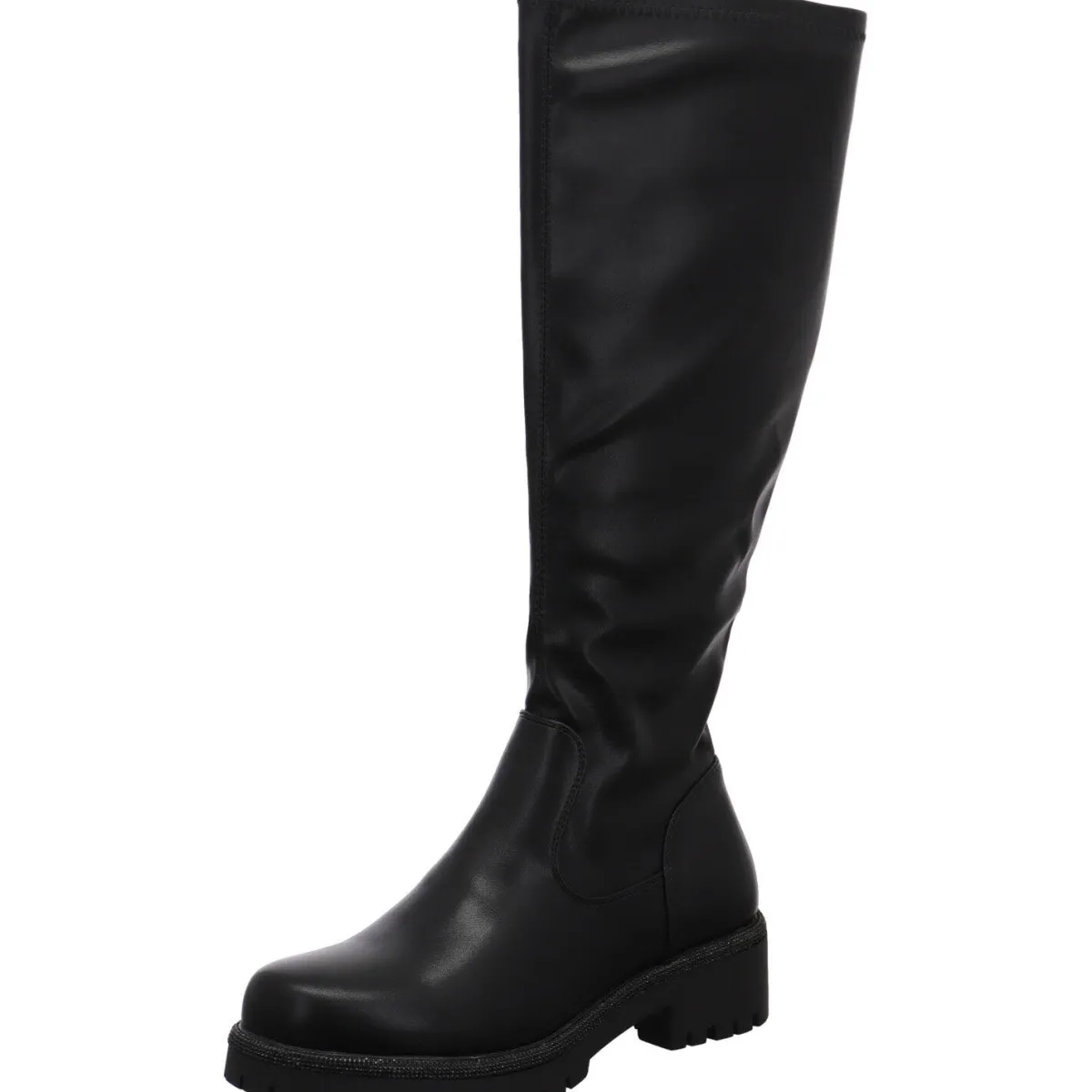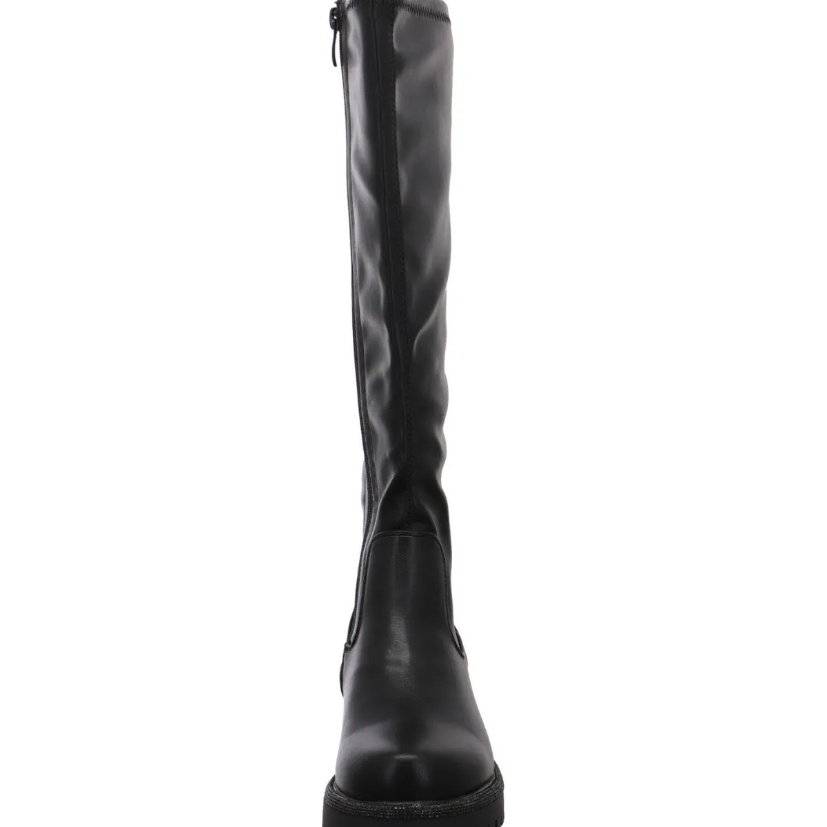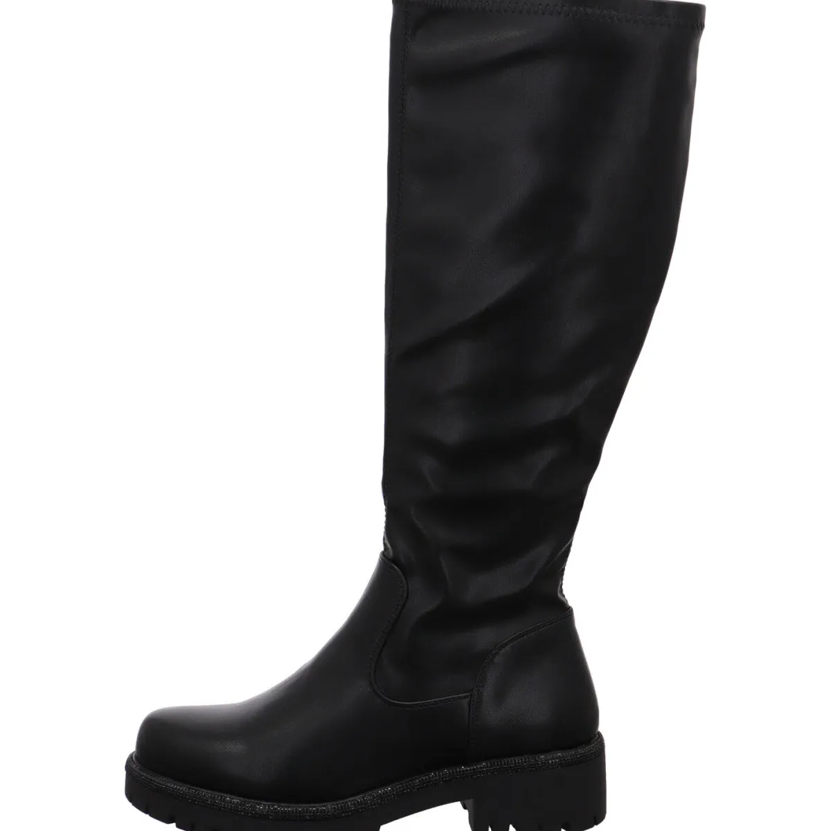 Er ist mit einer markanten Sohle mit Blockabsatz gearbeitet. Diese ist mit einer Umrandung mit vielen kleinen Glitzersteinen verstehen. Damit wird der Stiefel zum Eyecatcher bei jedem Outfit und Anlass.