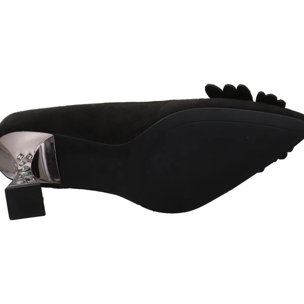 Das Obermaterial aus Textil in Schwarz ist auf dem Blatt mit einem Schmetterling verziert. Dieser ist mit Ziersteinen versehen und funkelt. Die elegante Linienführung und er modische Absatz mit Glitzersteinen in Silber runden das Design perfekt ab. Die Echtleder Innensohle ist dabei angenehm, weich gepolstert.