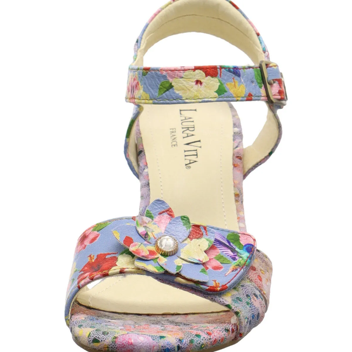 Er wurde aus einem Mix aus hochwertigem Nubukleder und genarbtem Glattleder in hellem Blau gefertigt, welches mit einem tollen floralen Muster und vielen anderen Farben versehen ist. Eine präzise aufgenähte Blume auf dem Riemen, welche zusätzlich mit einem Glitzerstein versehen wurde, ist ein tolles Highlight.