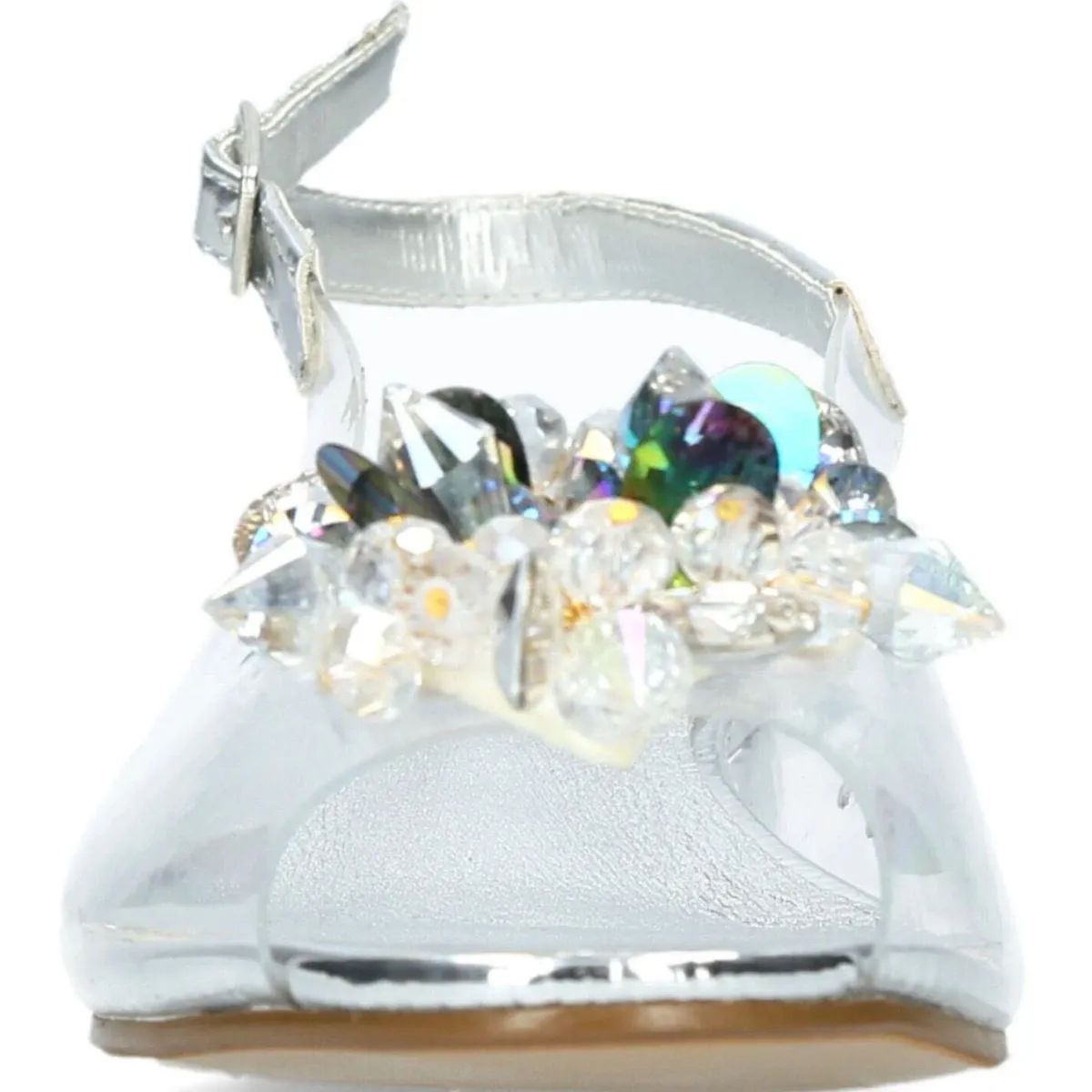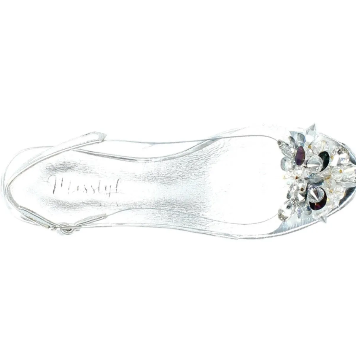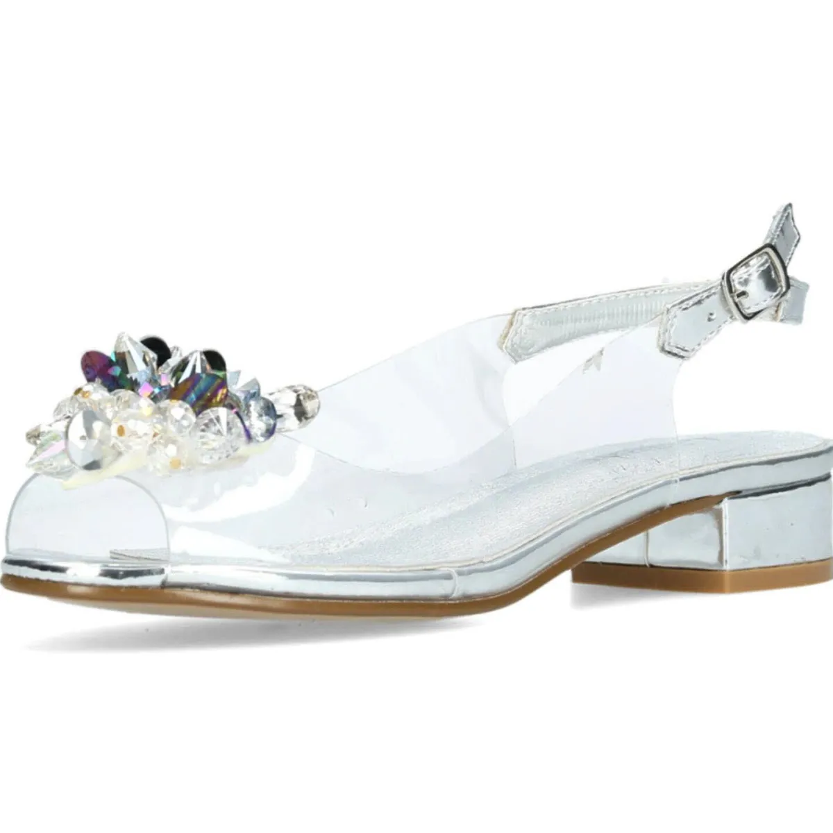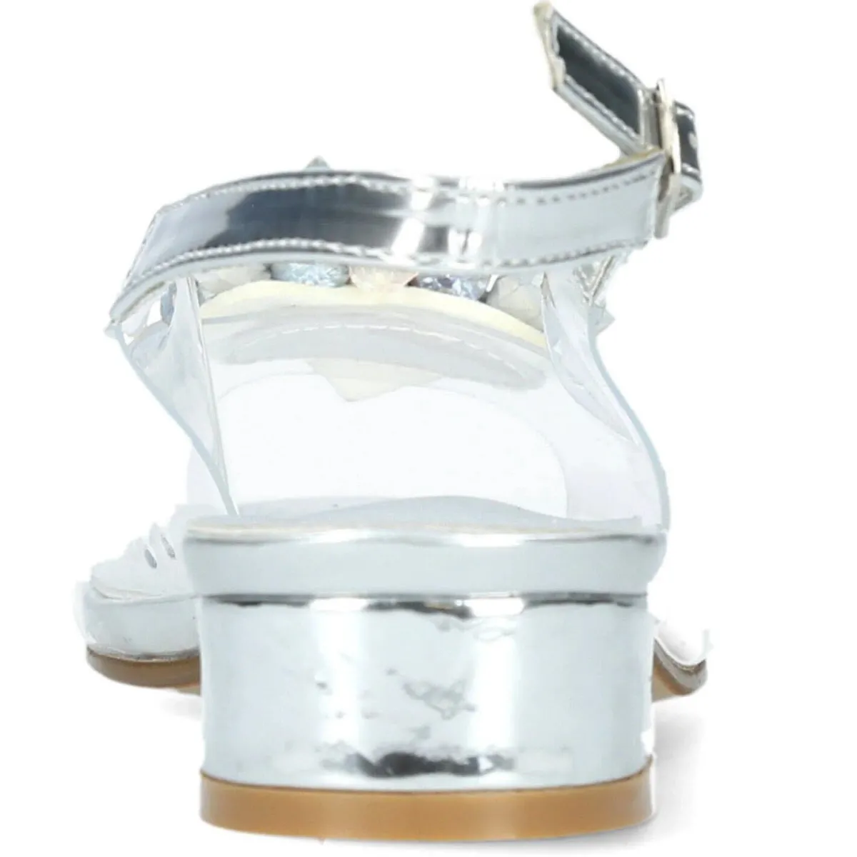 Der Schuh begeistert durch sein elegantes Design, das synthetische Obermaterial ist transparent und wirkt dadurch gläsern. Die Peeptoe Schuhspitze verleiht ihm eine tolle Optik. Der Blockabsatz ist Silber und überaus bequem.