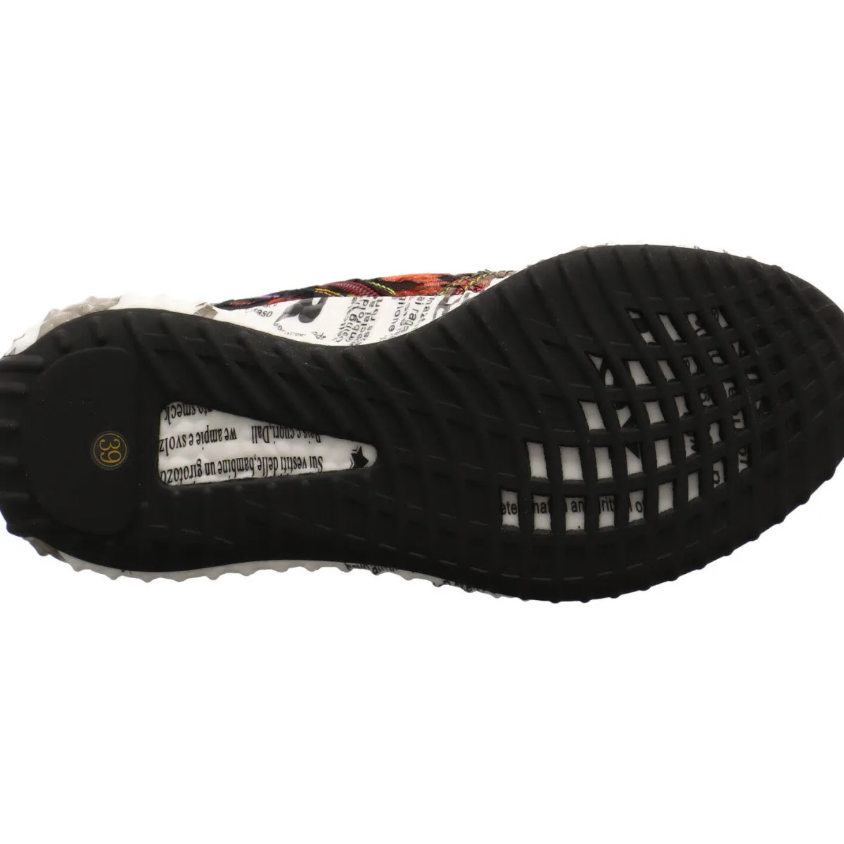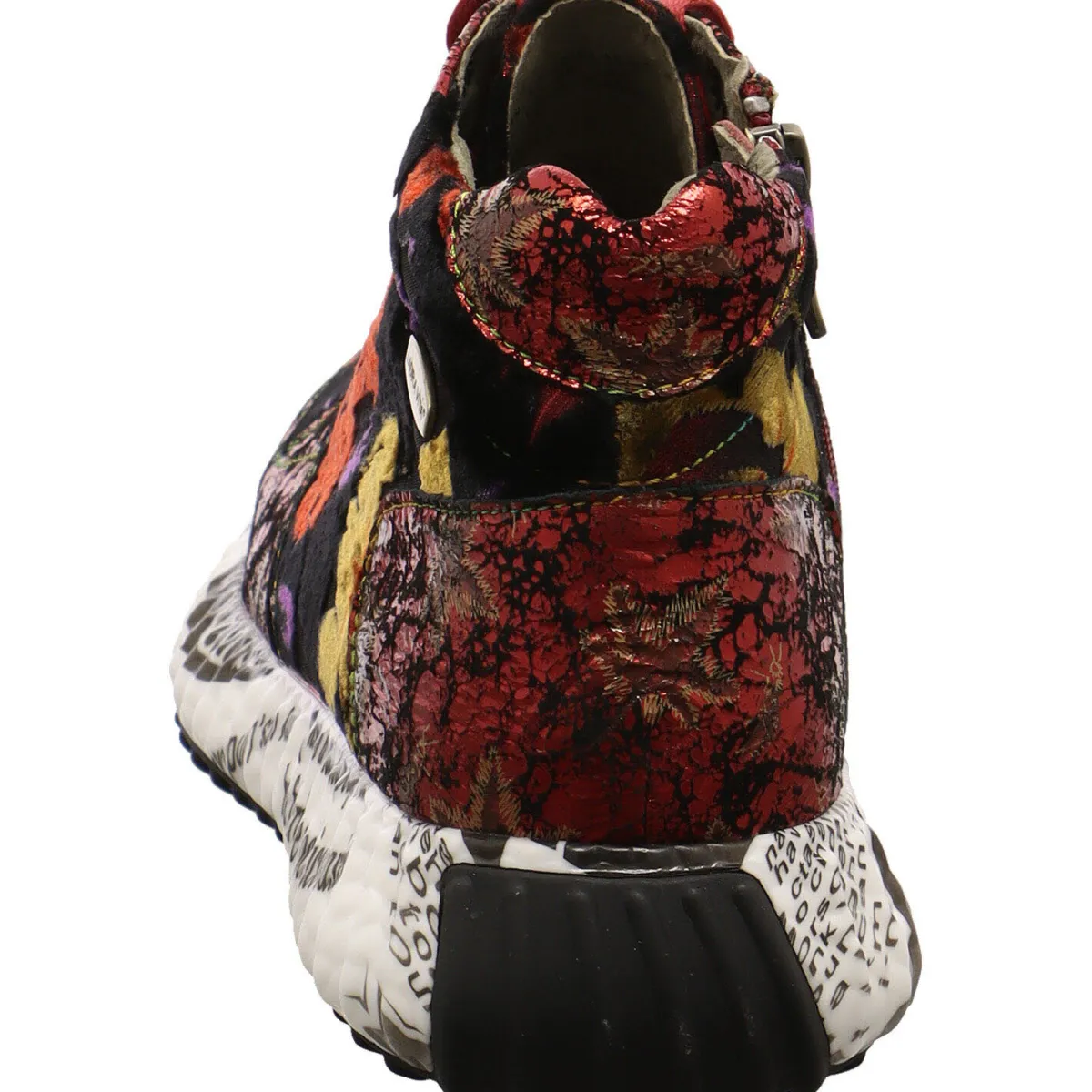 Er wurde aus hochwertigem Nubukleder und Textil in Rot gefertigt, welches mit einer Overlaystruktur versehen ist. Kleine Blumen und Blätter in Herbst Farben, wie Gold und Grün, sind präzise aufgedruckt und an der Ferse, sowie an der Schuhspitze befinden sich weitere Einsätze mit einem individuellen Muster. Das Lettering in Schwarz an der Sohle in Weiß rundet den sportlichen Look gekonnt ab. Die Schnürung sorgt für eine individuelle Anpassung des Schuhs an den Fuß. Zudem ist der Sneaker durch die Echtleder Innenausstattung angenehm zu tragen und durch sein herausnehmbares Wechselfußbett überaus praktisch. Durch den seitlichen Reißverschluss ist ein komfortabler Einstieg möglich.
