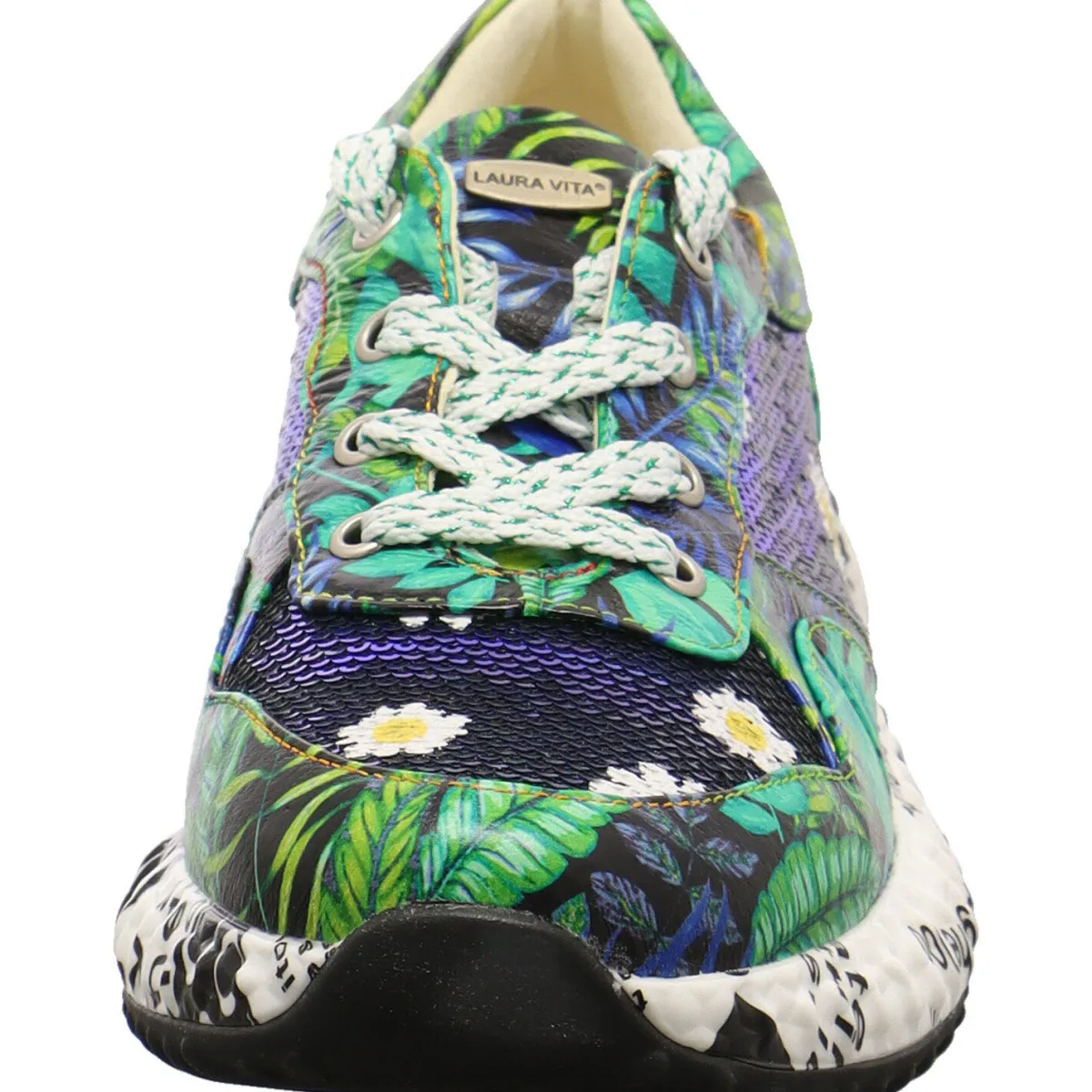 Er wurde aus einem Mix aus hochwertigem Echtleder und Paillettenbesetztem Textil in Grün gefertigt. Das Design der Blätter in Blau und Grün erstreckt sich über den gesamten Sneaker. Die Paillleten befinden sich jeweils an den Seiten und auf dem Blatt, wo sich kleine Blumen in Weiß abbilden. Das Lettering in Schwarz an der Sohle in Weiß rundet den sportlichen Look gekonnt ab. Die Schnürung in Weiß, mit Glitzerdetails in Grün sorgt für die individuelle Anpassung des Schuhs an den Fuß. Zudem ist der Sneaker durch die Echtleder Innenausstattung angenehm zu tragen und durch sein herausnehmbares Wechselfußbett überaus praktisch.