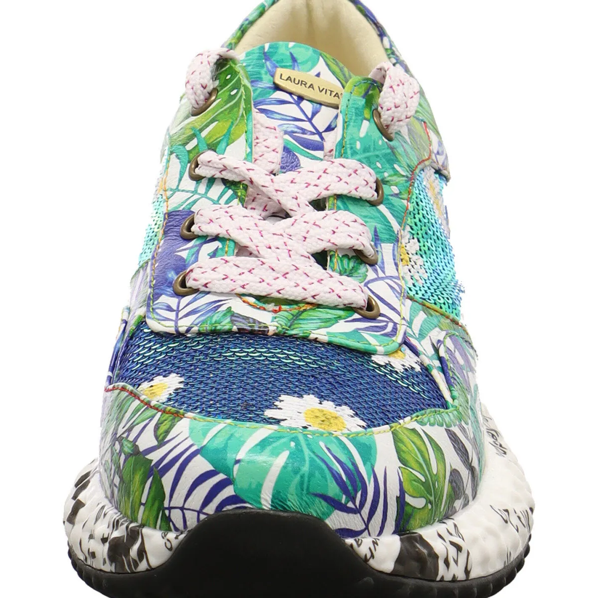 Er wurde aus einem Mix aus hochwertigem Echtleder in Weiß und Paillettenbesetztem Textil in Grün, Blau und Rosa gefertigt. Das Design der Blätter in Blau und Grün erstreckt sich über den gesamten Sneaker. Die Paillleten befinden sich jeweils an den Seiten und auf dem Blatt, wo sich kleine Blumen in Weiß abbilden. Das Lettering in Schwarz an der Sohle in Weiß rundet den sportlichen Look gekonnt ab. Die Schnürung in Weiß, mit Glitzerdetails in Pink sorgt für die individuelle Anpassung des Schuhs an den Fuß. Zudem ist der Sneaker durch die Echtleder Innenausstattung angenehm zu tragen und durch sein herausnehmbares Wechselfußbett überaus praktisch.