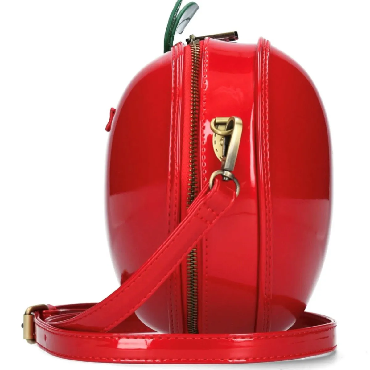 Sie wurde in Form eines Apfel gearbeitet und ist Lack Rot. Du kannst sie mit einem Reißverschluß öffnen. Innen findest du ein schönes Blumen Muster. Sie bietet Platz für die Kleinigkeiten auf die du nicht verzichten möchtest. Am Taschenboden sind vier Metall Nieten in Gold angebracht, dadurch hat sie einen optimalen Stand. Mit dem verstellbaren Umhängegurt kannst du sie bequem Crossover tragen.