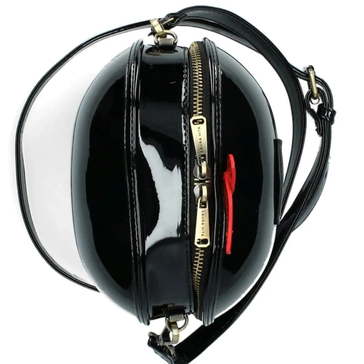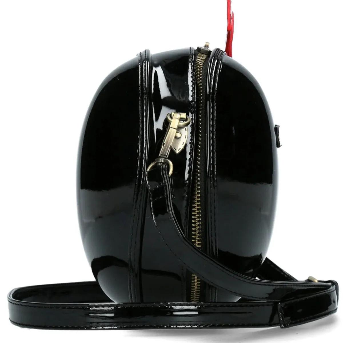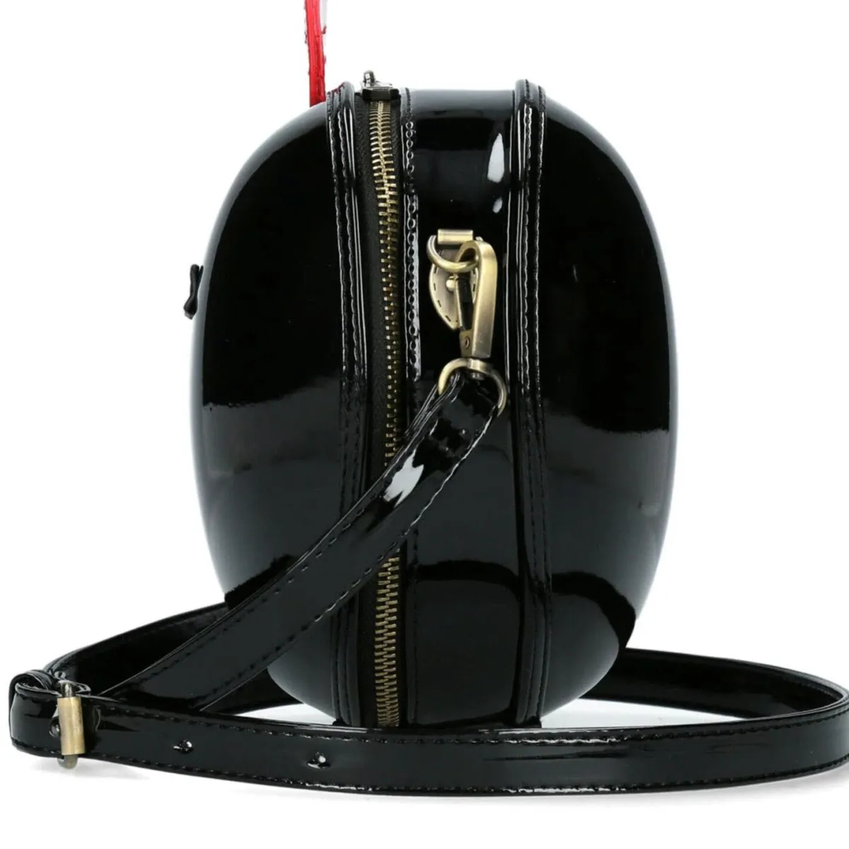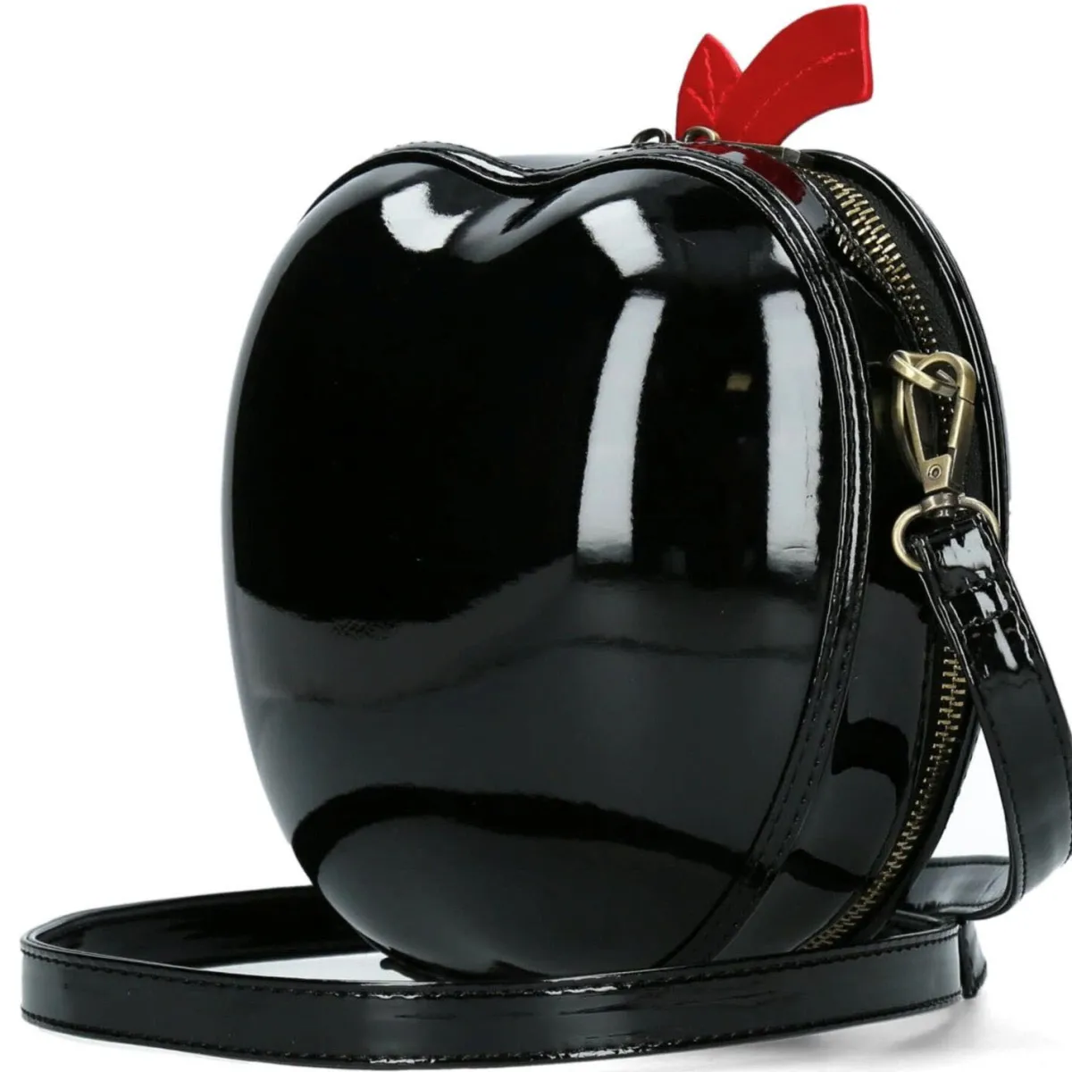 Sie wurde in Form eines Apfel gearbeitet und ist Lack Schwarz mit Rot. Du kannst sie mit einem Reißverschluß öffnen. Innen findest du ein schönes Blumen Muster. Sie bietet Platz für die Kleinigkeiten auf die du nicht verzichten möchtest. Am Taschenboden sind vier Metall Nieten in Gold angebracht, dadurch hat sie einen optimalen Stand. Mit dem verstellbaren Umhängegurt kannst du sie bequem Crossover tragen.