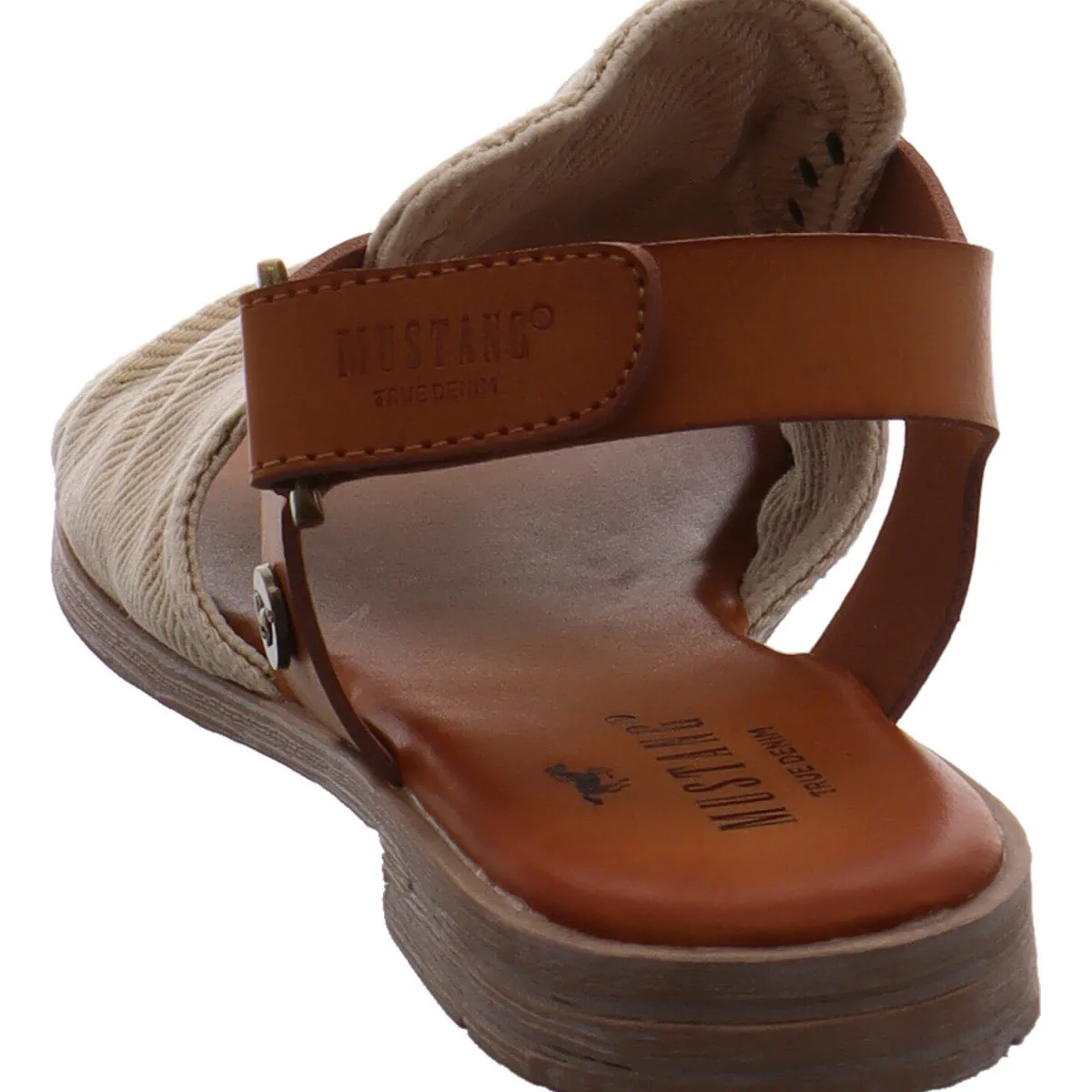 Gefertigt aus einem Mix aus Textil und Kunstleder, fällt sofort der breite Riemen in Jeans Beige ins Auge. Dieser ist mit dem Riemen in Cognac Braun verbunden und ergibt zusammen eine tolle Farbkombination. Weitere tolle Details, sind die Nieten und die Schnalle in Alt Gold und die Niete mit dem Mustang Logo an der Seite.