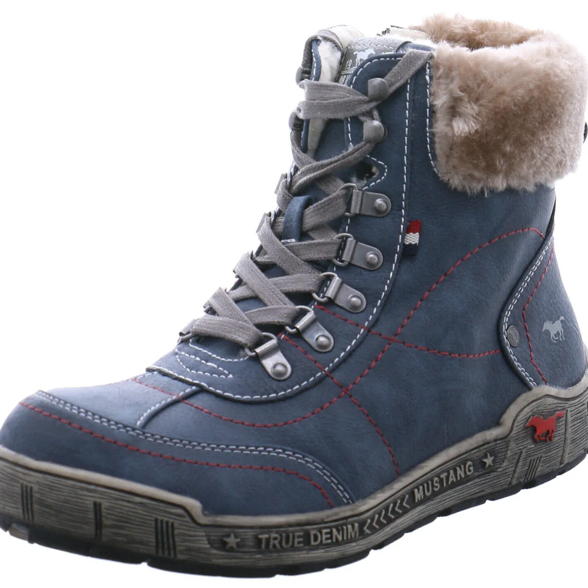 Authentisch genarbtes Obermaterial aus Kunstleder in Blau wird mit kontrastfarbenen Schnürsenkeln und Ziernähten in Rot kombiniert und gibt dem Schuh das gewisse Etwas.