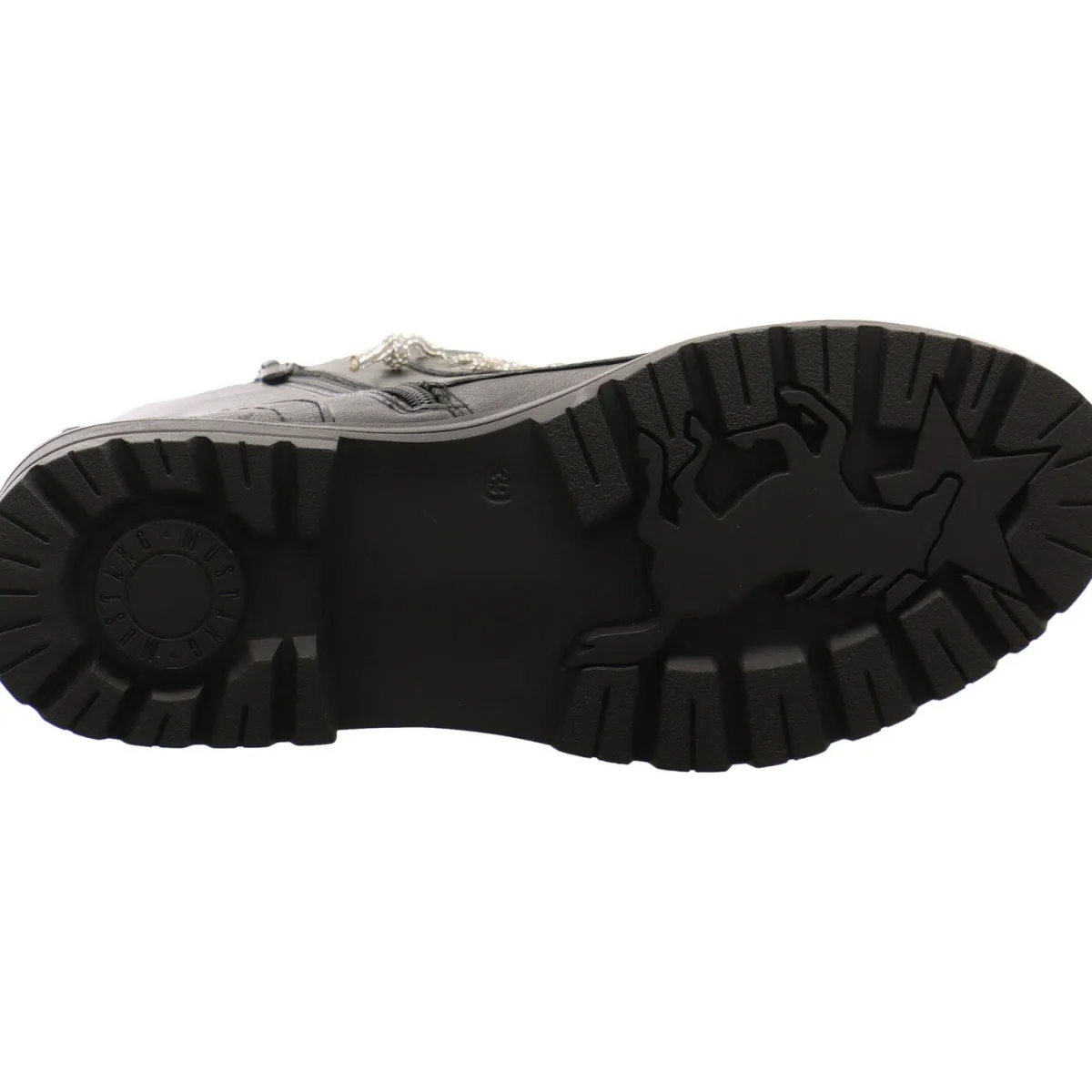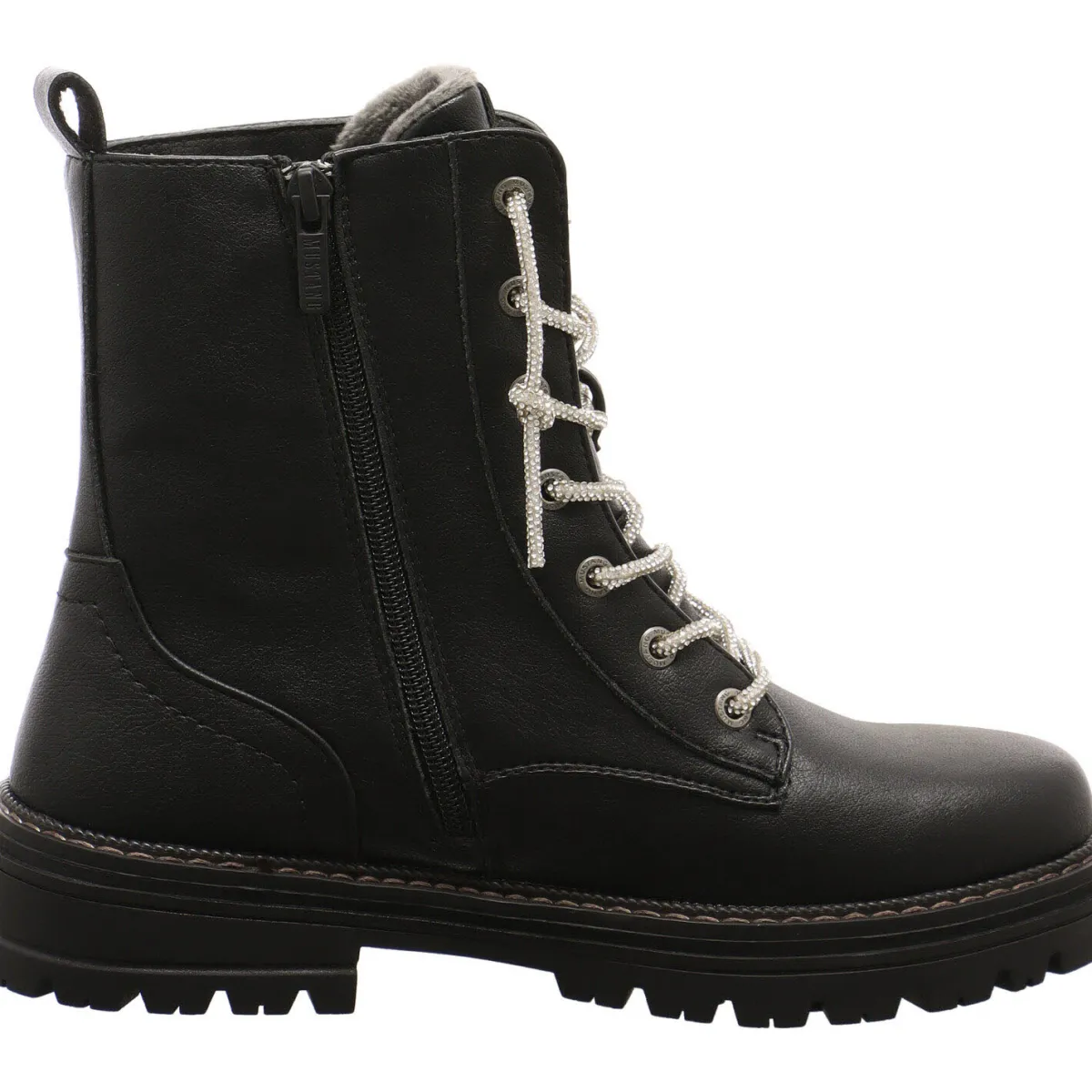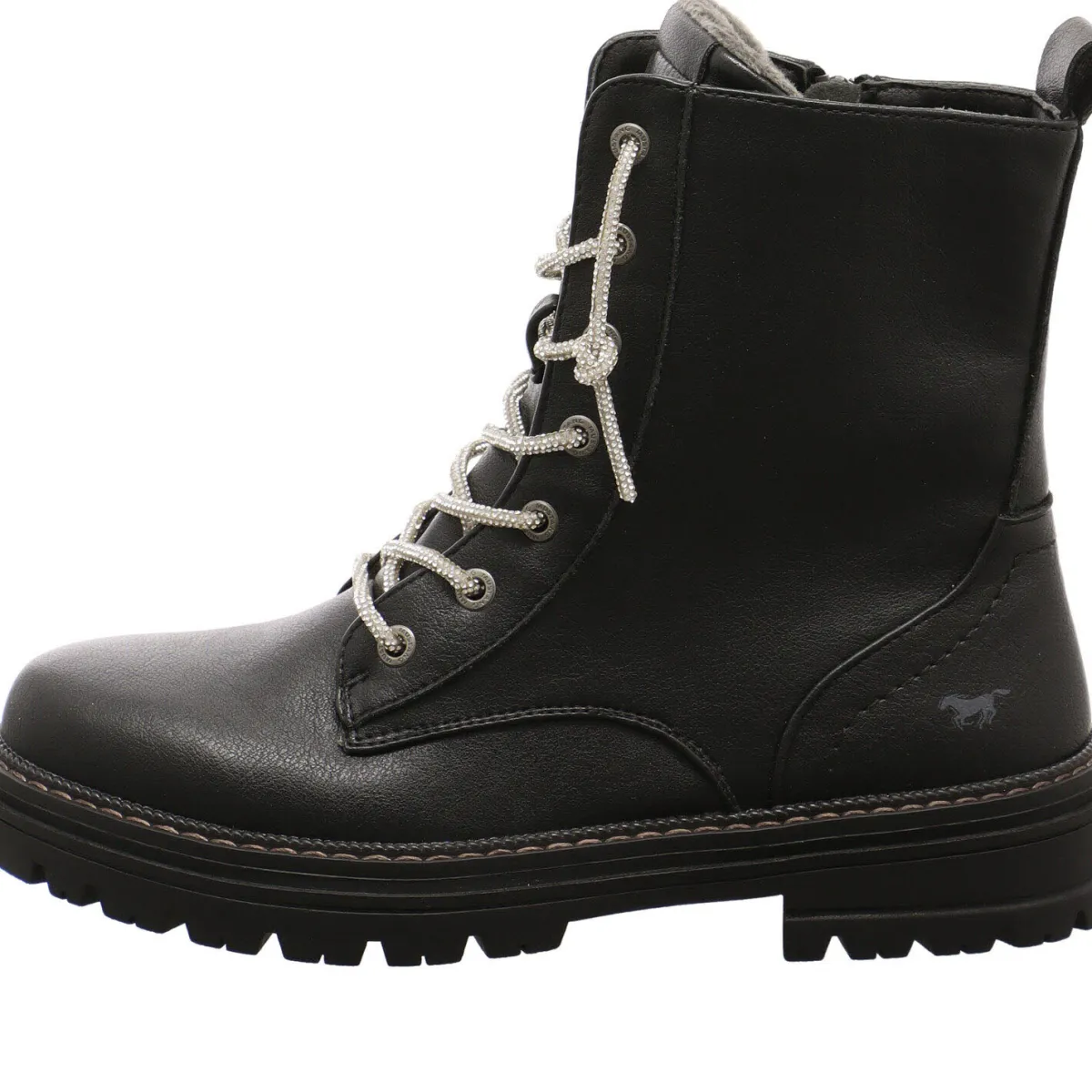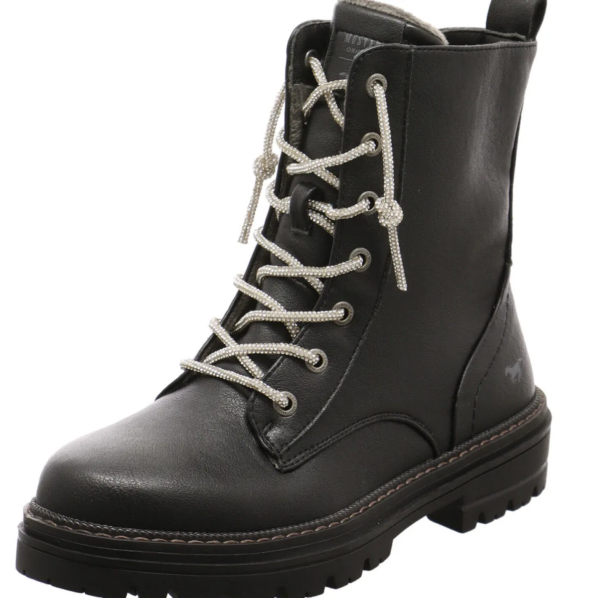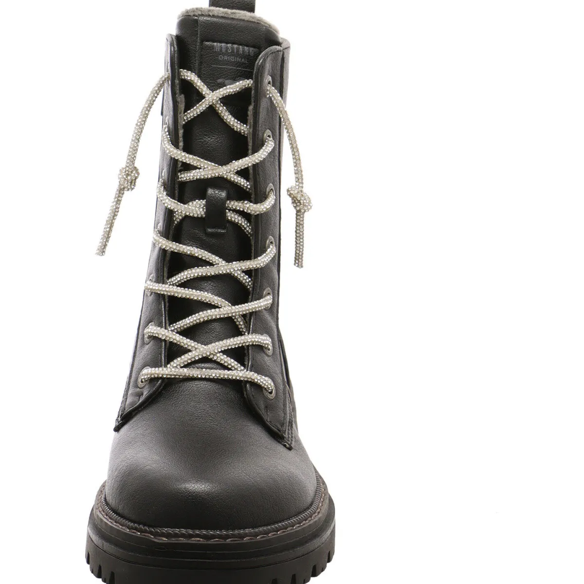 Das Obermaterial in Schwarz aus Kunstleder wird durch die Schnürung in Form einer Art Glitzerkette gekonnt in Szene gesetzt.