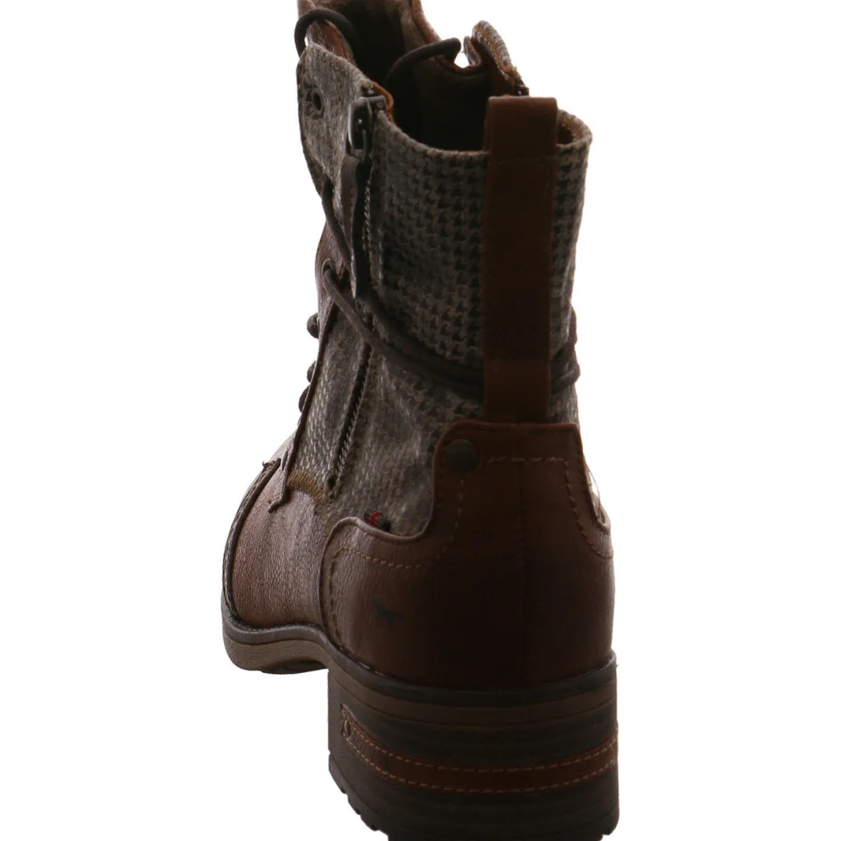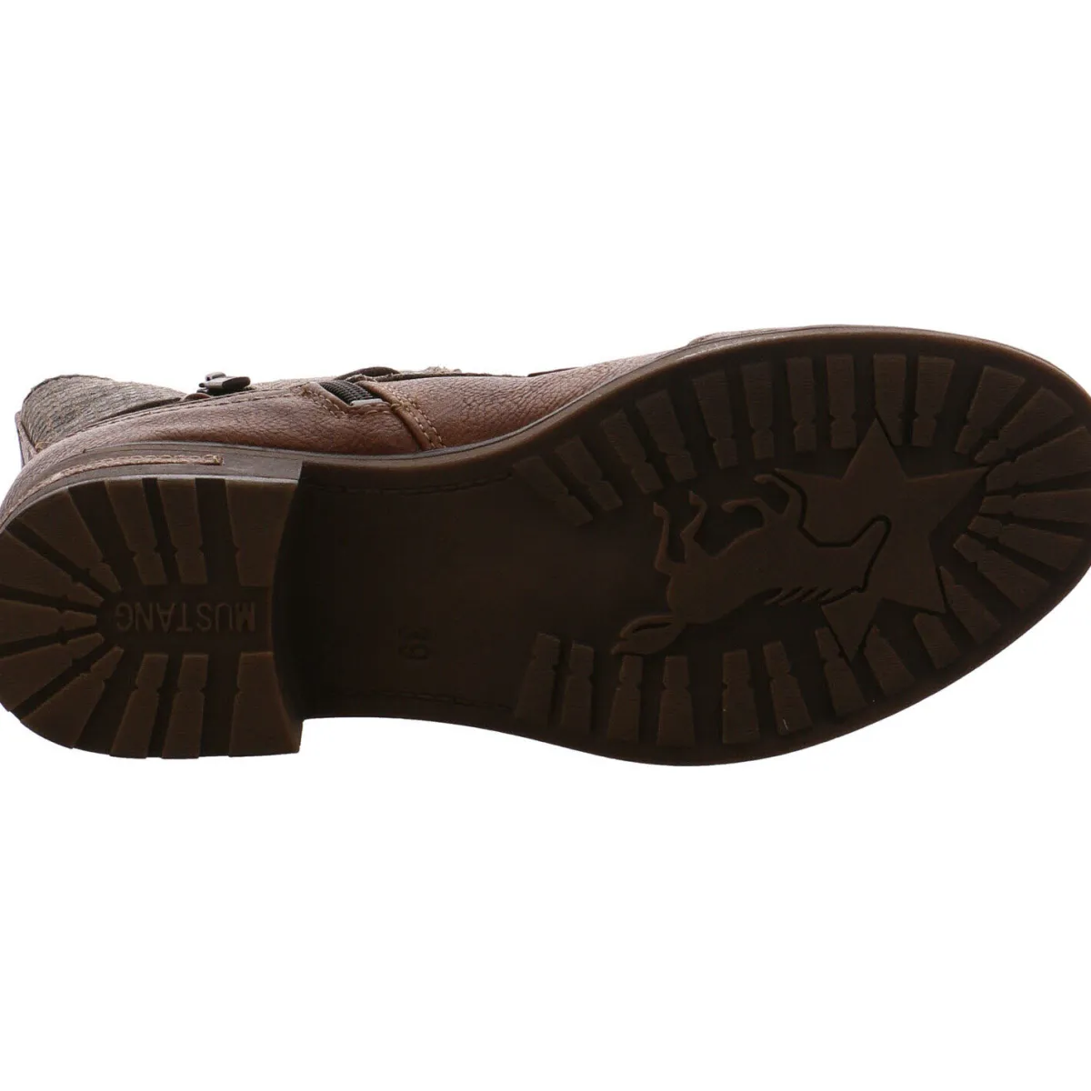 Gefertigt aus authentisch genarbtem Kunstleder in Braun besticht sie durch den farblich abgesetzten Einsatz in Grau mit Hahnentritt Muster. Der Blockabsatz ist mit einem Einsatz mit dem Marken Logo versehen und rundet das Design gekonnt ab.