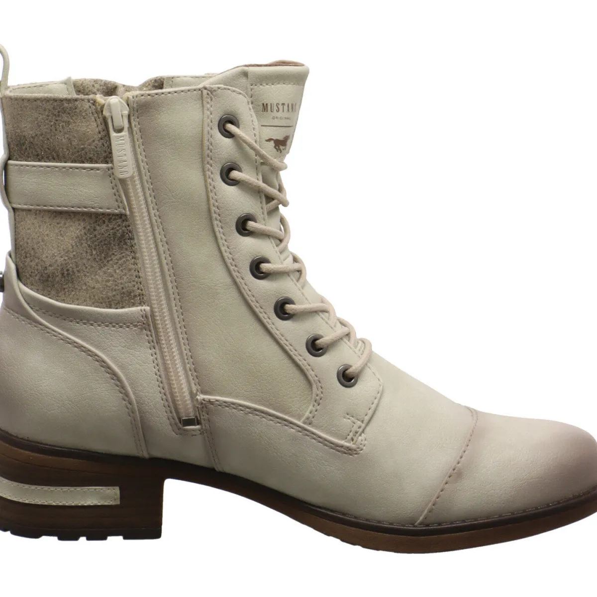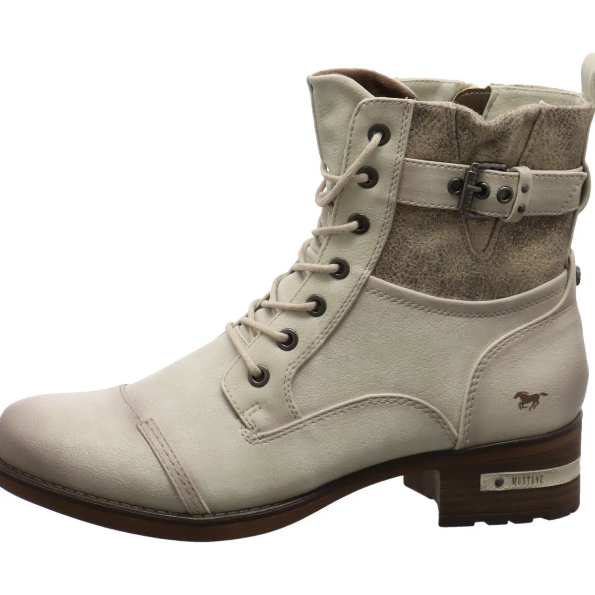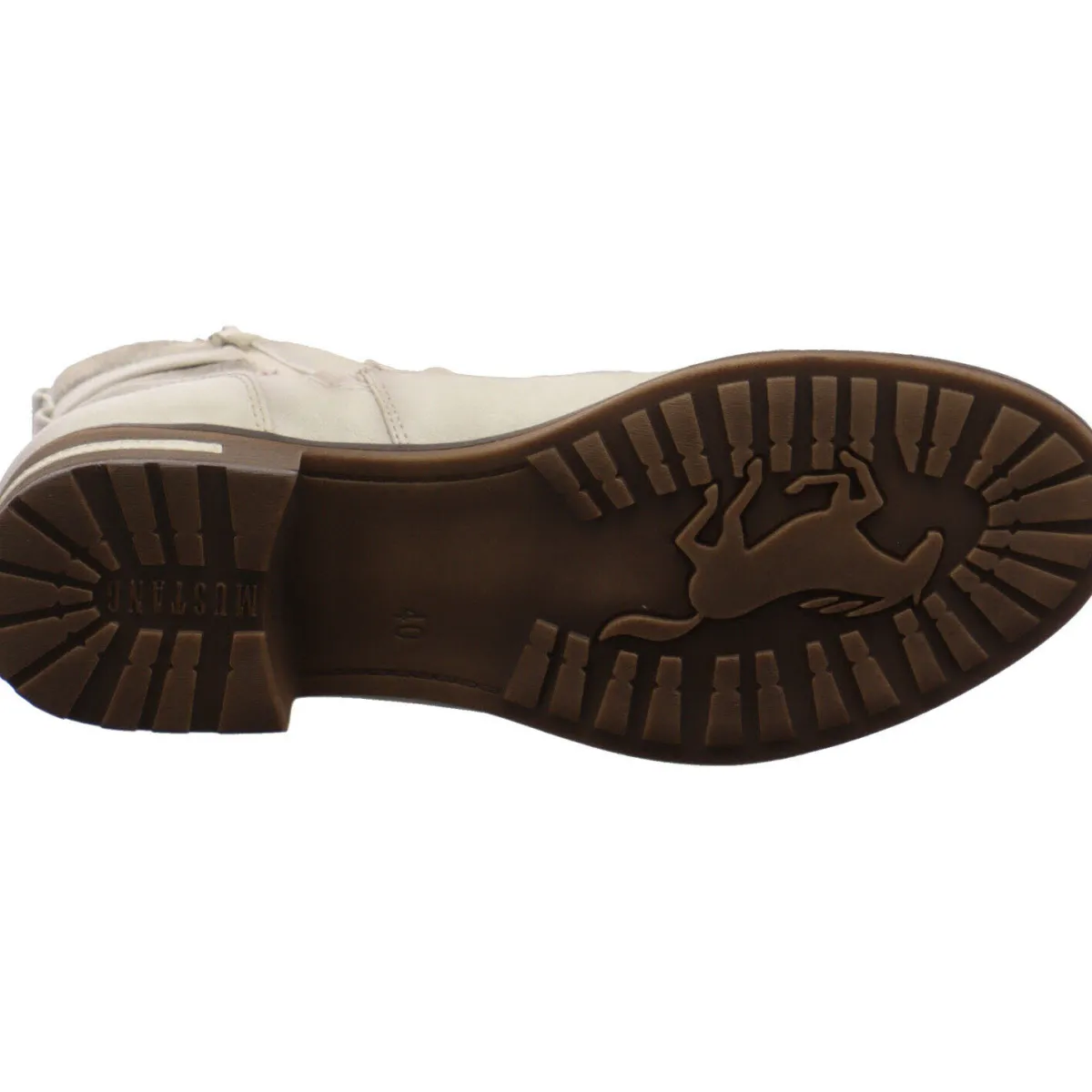 Der Blockabsatz mit einer Höhe von 4 cm sowie die leicht profilierte Laufsohle mit integriertem Mustang-Logo runden das Gesamtkonzept ab.