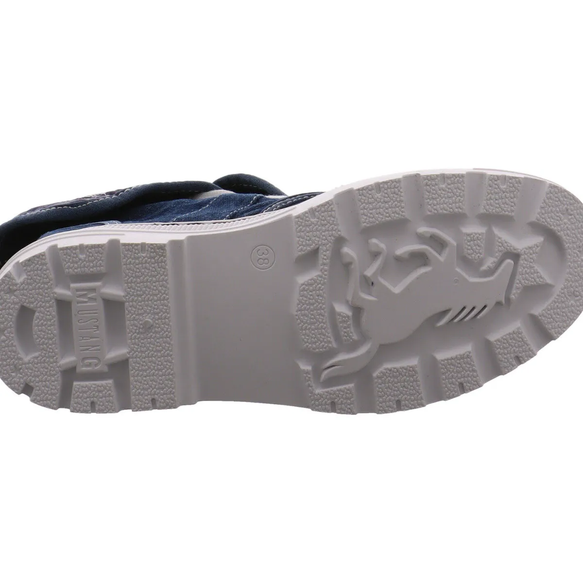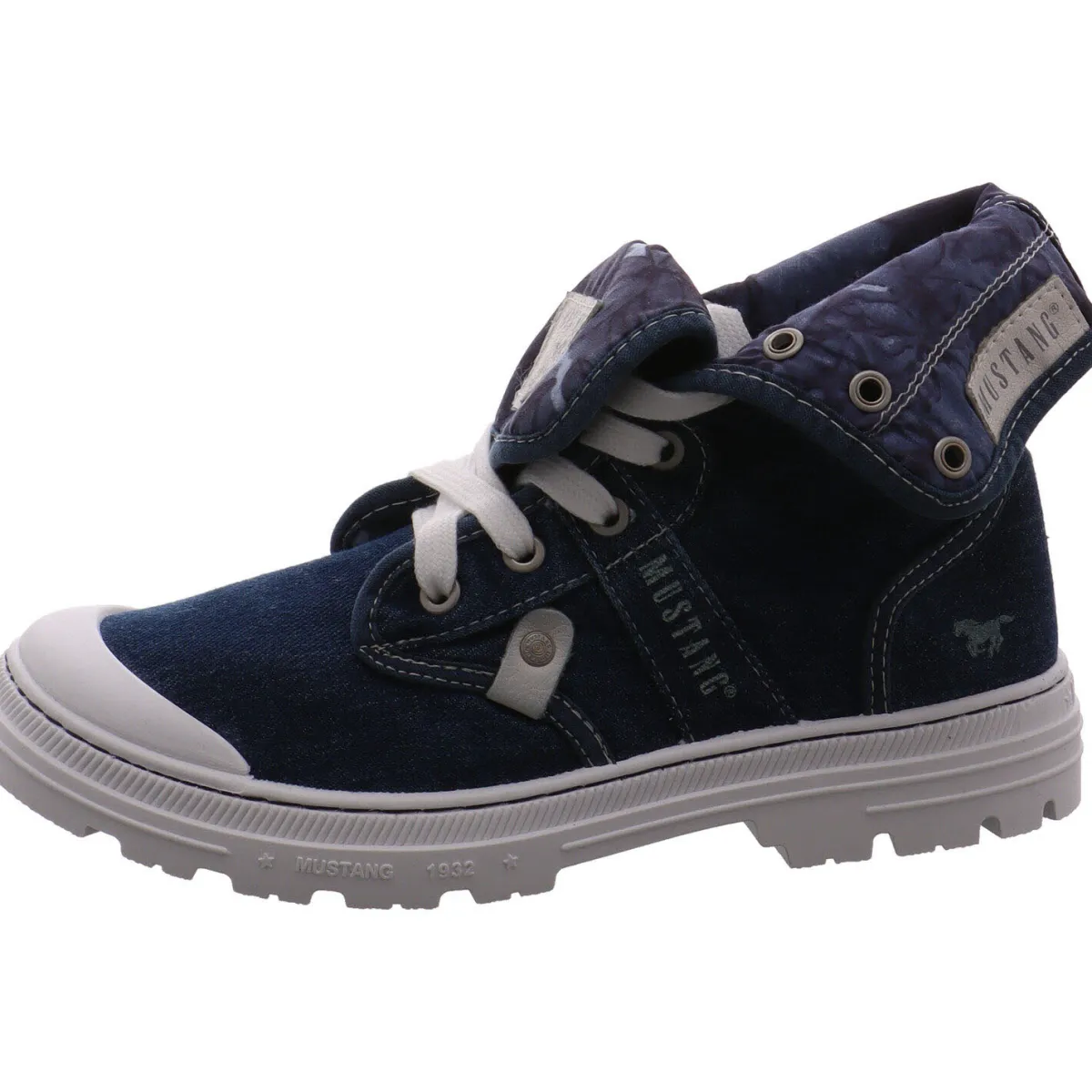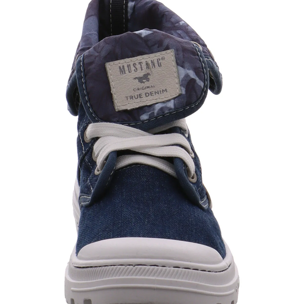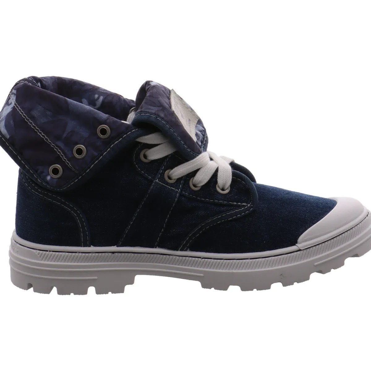 Gefertigt aus Textil im Denim Look in Jeans Blau, welches durch die Schnürsenkel und die Synthetik Kappe in Weiß toll zur Geltung kommt. Die Innenseite des Schuhs ist mit einem Blumen Muster gefertigt. Man kann den Oberen Teil des Schuhs runterklappen, damit das Blumen Muster zur Geltung kommt. Natürlich kann man den Schuh aber auch tragen, indem man die Schnürsenkel bis oben hin schnürt. Weitere Details sind die Ziernähte und die auffälligen Nieten.