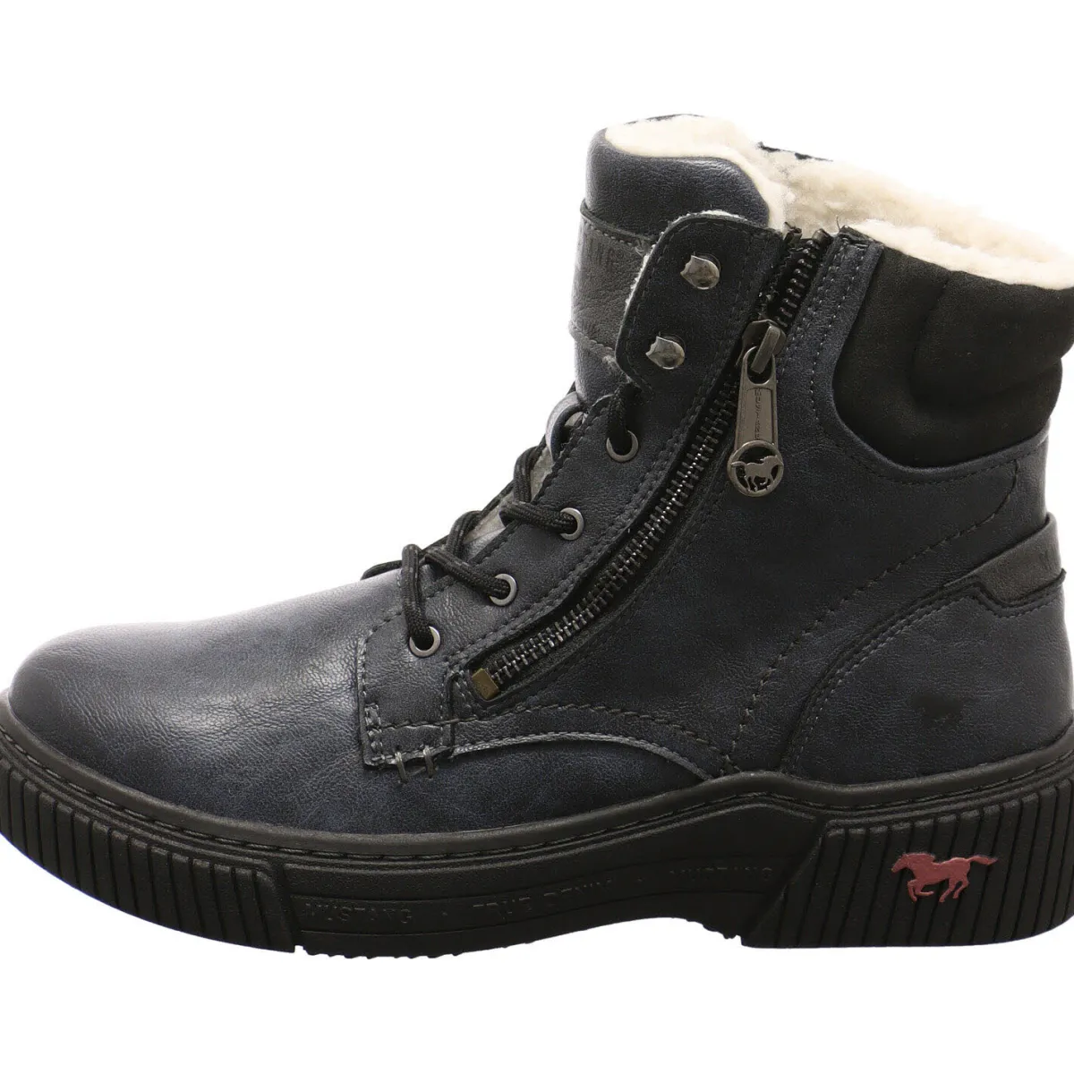 Authentisch genarbtes Obermaterial aus Kunstleder in Blau, wird mit kontrastfarbenen Schnürsenkeln und einem Textil Einsatz am Schaft in Schwarz kombiniert und gibt dem Schuh das gewisse Etwas.