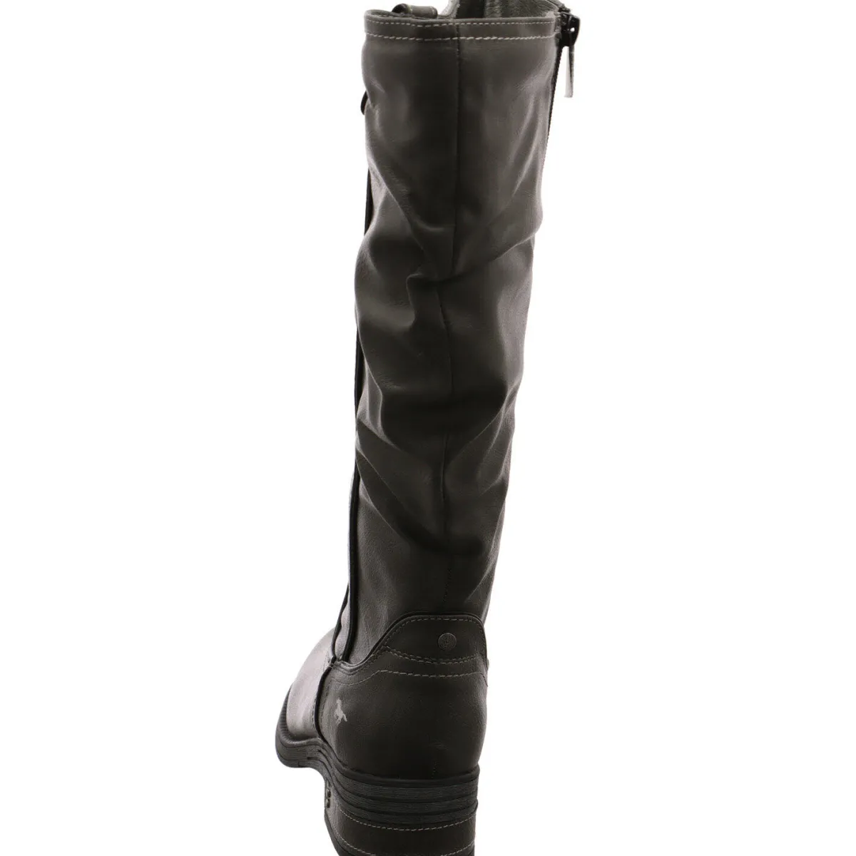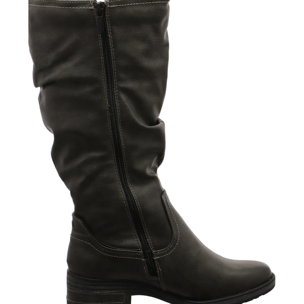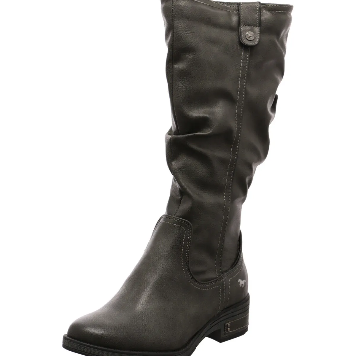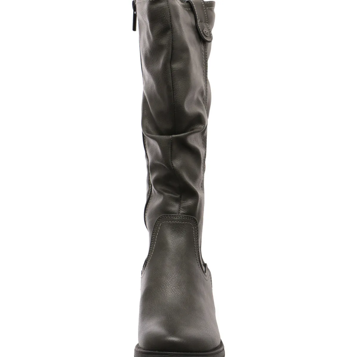 Gefertigt aus Kunstleder in Grau, ist der lange Schaft stilvoll in Falten gelegt. Ein kleiner Riemen am Schaftrand ist ein weiterer Hingucker.