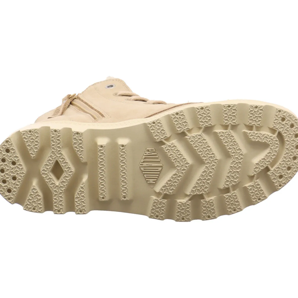 Das Obermaterial des Schnürboots für Damen wurde aus Echtleder in Beige gefertigt. Highlights sind das Label auf der Zunge, sowie der Gummiaufnäher an der Außenseite.
